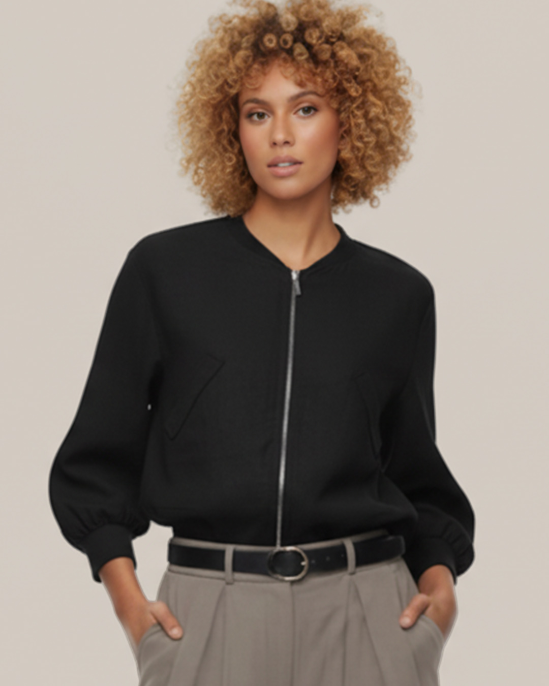 Chaqueta Bomber Chic ▷ ¡Añade un toque urbano a tus looks! Esta bomber en un es la prenda ideal para destacar esta temporada. Confeccionada con un tejido ligero y un corte amplio, su cintura con cordón y puños elásticos le dan un toque moderno. Perfecta para combinar con jeans o un vestido para un estilo casual. ¡No puede faltar en tu armario!