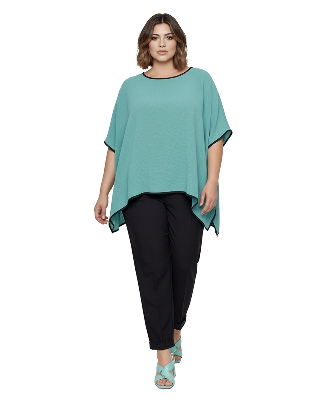 Blusa Capa ▷ Esta sofisticada prenda destaca por su tejido fluido con un sutil efecto arrugado que aporta textura y estilo. Su diseño de corte capa con vivos a contraste ofrece una caída espectacular que sienta de maravilla a mujeres reales de tallas curvy que confían en el estilo de Quiles_Shop.