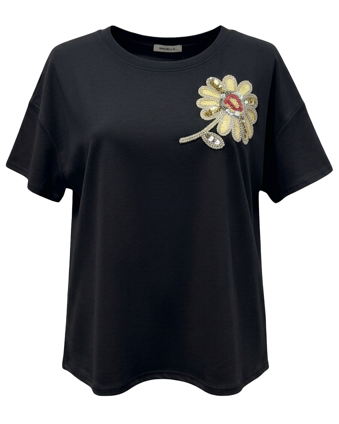 Camiseta Patch ▷ Esta prenda está confeccionada en un tejido suave que garantiza una comodidad excepcional durante todo el día. Su diseño destaca por un espectacular aplique floral de lentejuelas y pedrería en el pecho, ofreciendo un estilo joven y lleno de luz para las mujeres reales que eligen destacar en Quiles_Shop.