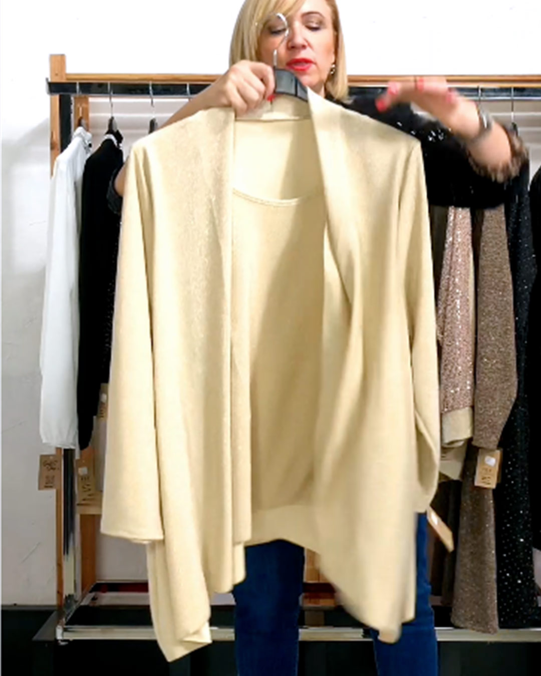 ¡Dos en uno y con mucho estilo! Nuestra blazer-camiseta es el comodín perfecto para cualquier armario. Con su tejido de punto brillante y su diseño innovador, te sentirás cómoda y a la moda. ¡Ideal para cualquier ocasión! ¡No te quedes sin la tuya y brilla donde vayas!