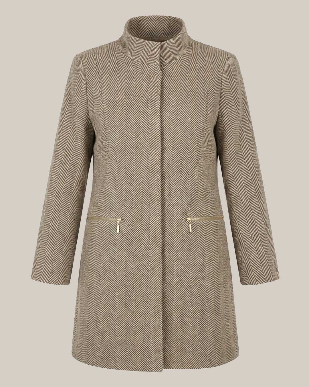 Abrigo Viena ▷ ¡La sofisticación hecha prenda! Este abrigo destaca por su clásico dibujo de espiga, ofreciendo un estilo impecable y cálido. Su diseño estructurado cuenta con cuello subido y elegantes cremalleras laterales en dorado. La pieza clave para elevar cualquier outfit invernal con la distinción de Quiles_Shop.