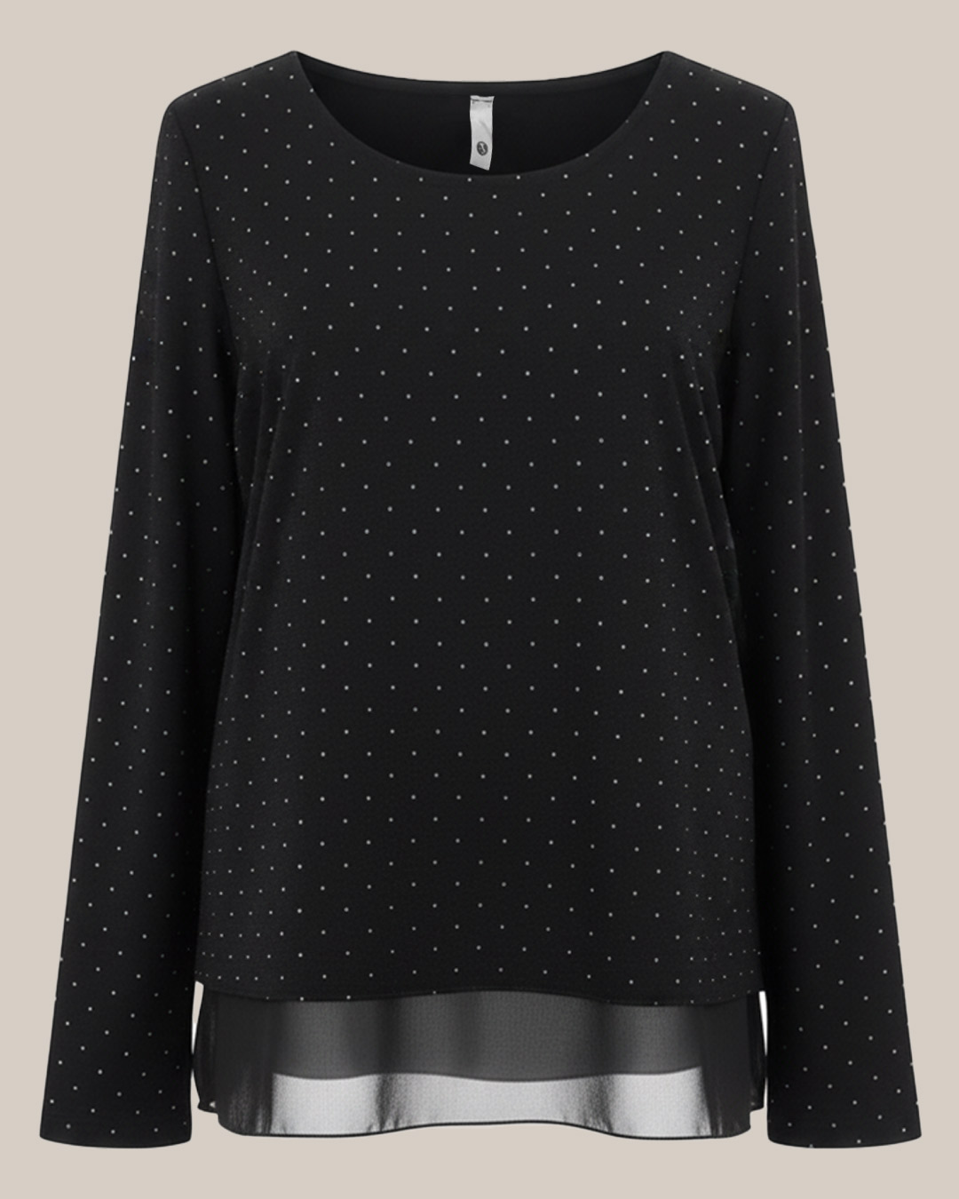 Blusa Diamante ▷ ¡Deslumbra en tus noches de fiesta con elegancia máxima! Esta blusa destaca por sus delicados destellos en strass y un favorecedor bajo de gasa. Su diseño fluido y sofisticado es ideal para combinar y brillar en cualquier evento especial. ¡Vístete de gala con Quiles_Shop!