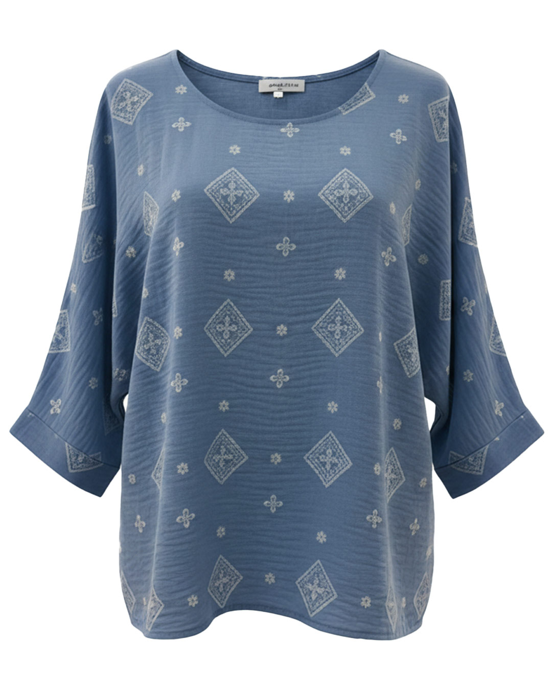 Blusa Efecto Denim ▷ Esta prenda combina la estética vaquera con la suavidad de la viscosa y un toque de elastán para que te quede impecable. Destaca por su print geométrico, cuello redondo y manga francesa con doble ancho, ofreciendo un estilo juvenil y moderno a mujeres reales de tallas curvy en Quiles_Shop.