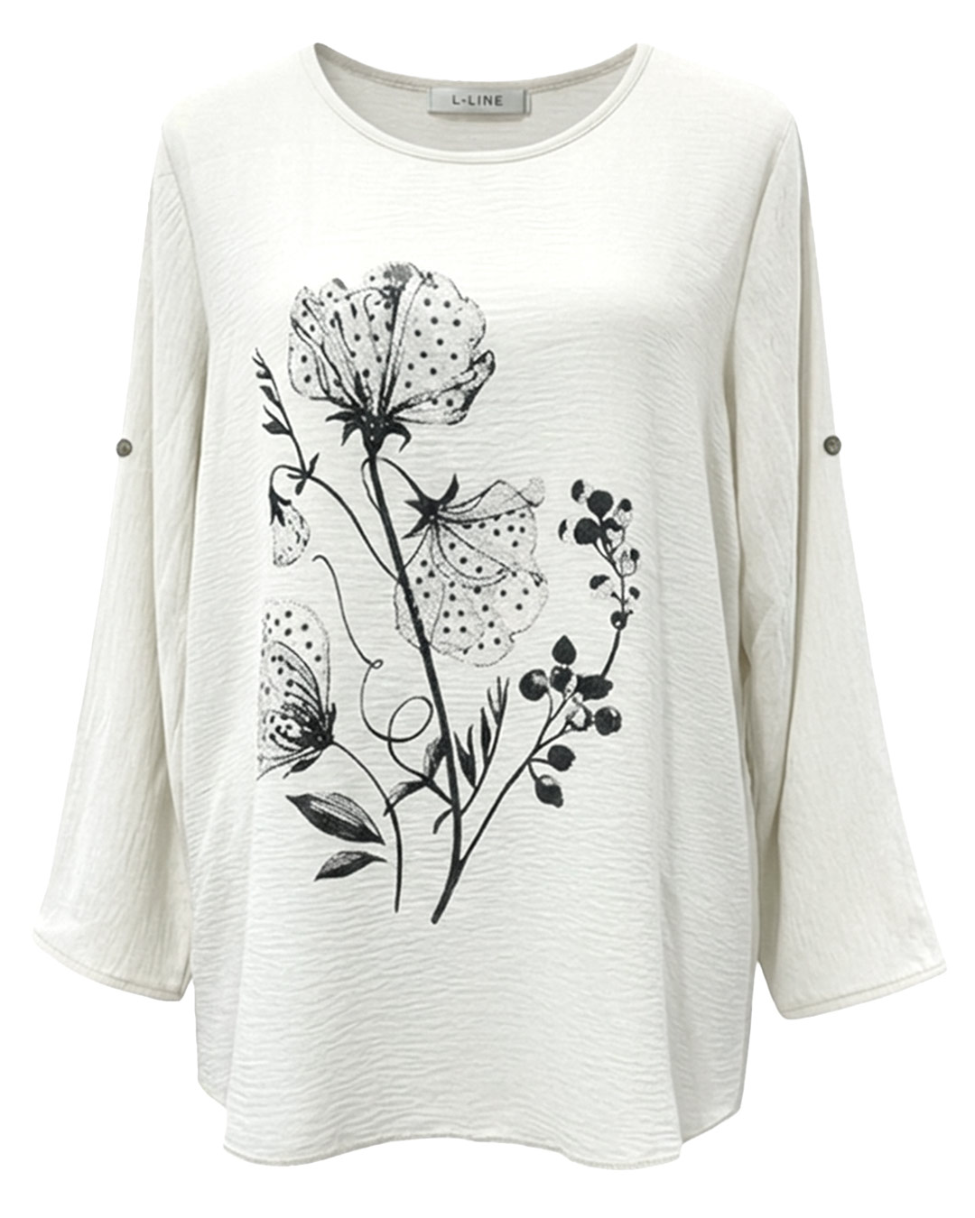 Blusa Floral ▷ Esta encantadora prenda destaca por su tejido fluido con efecto arrugado, ofreciendo una textura única y ligera. Presenta un delicado estampado floral artístico en el frontal y mangas regulables, siendo la opción perfecta para mujeres reales de tallas curvy que buscan un estilo femenino y natural en Quiles_Shop.