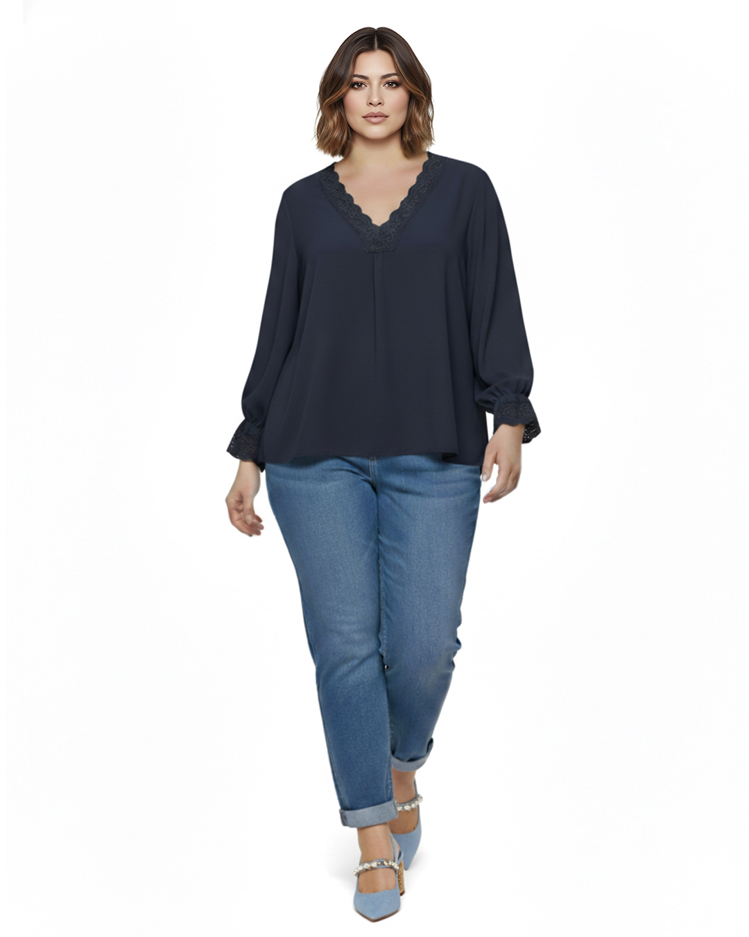Blusa Lencera ▷ ¡Pura sofisticación en un solo diseño! Esta prenda destaca por su delicado encaje en el escote y los puños, aportando un aire romántico y femenino. Su tejido fluido garantiza una caída impecable que favorece a todos los tipos de cuerpo. Es la pieza ideal para combinar con tus prendas favoritas en Quiles_Shop.
