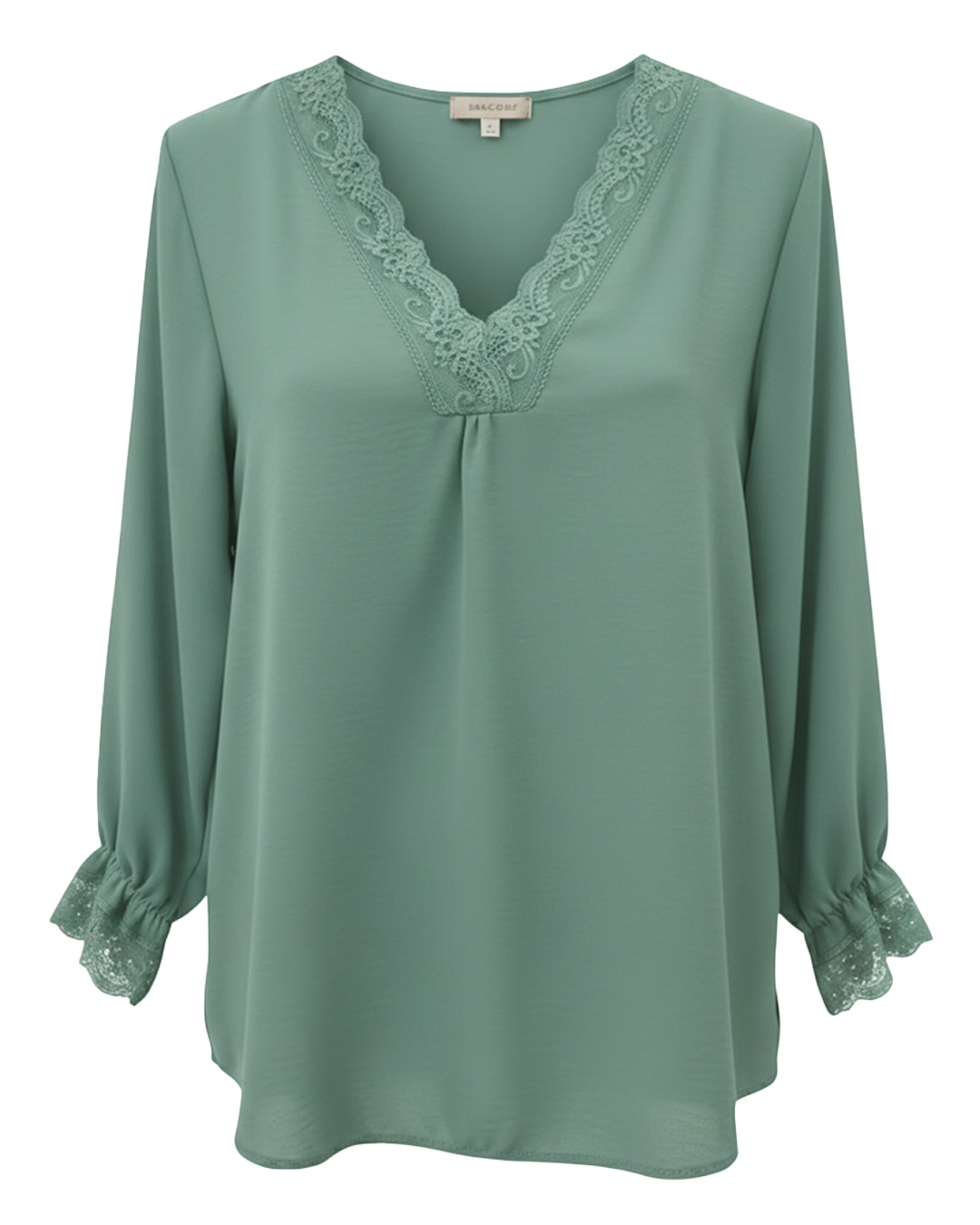 Blusa Lencera ▷ ¡Pura sofisticación en un solo diseño! Esta prenda destaca por su delicado encaje en el escote y los puños, aportando un aire romántico y femenino. Su tejido fluido garantiza una caída impecable que favorece a todos los tipos de cuerpo. Es la pieza ideal para combinar con tus prendas favoritas en Quiles_Shop.