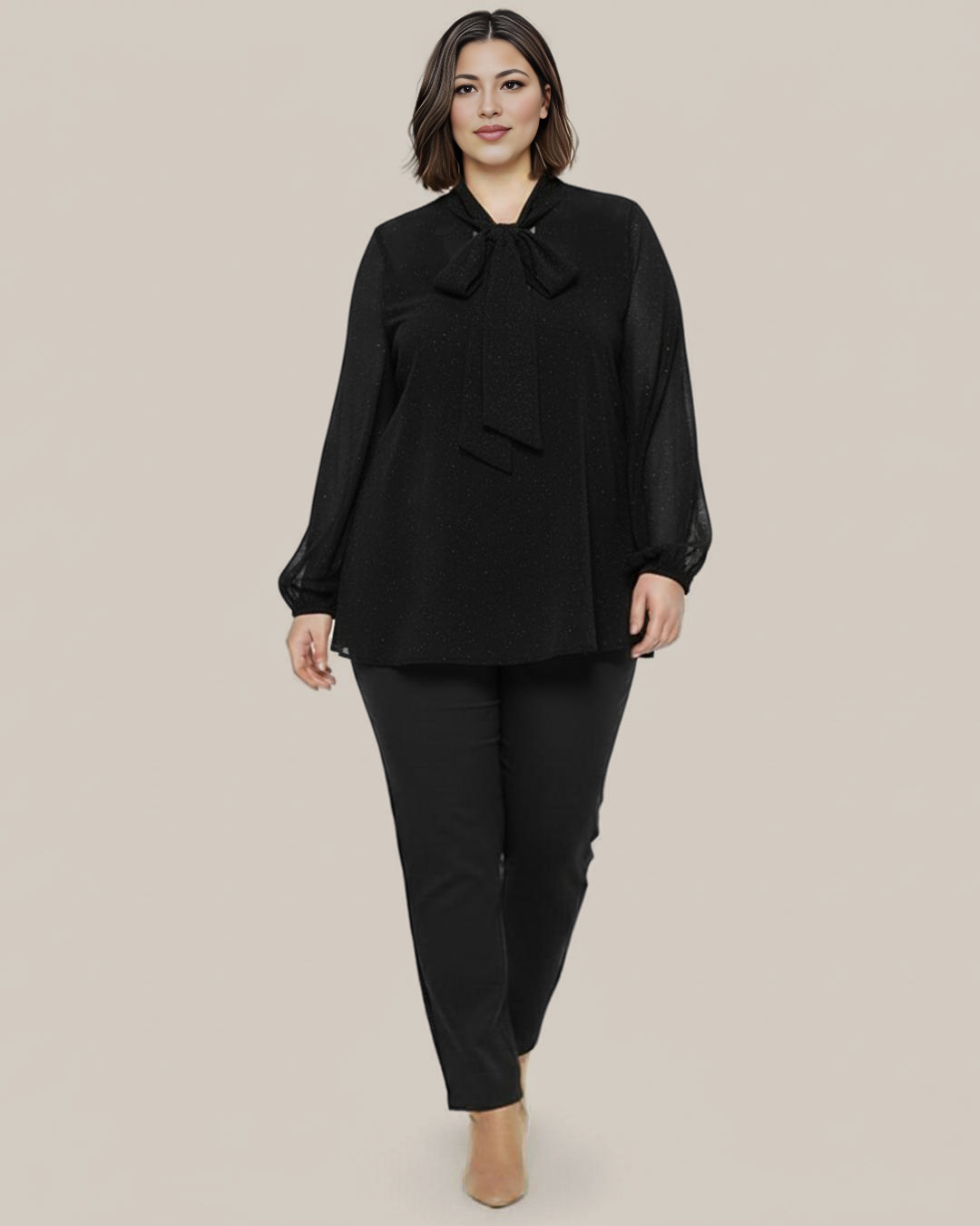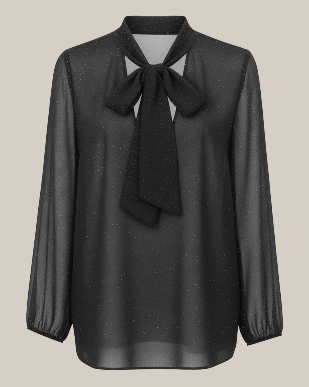 Blusa Luxe ▷ ¡Deslumbra con la elegancia más sofisticada este invierno! Esta blusa destaca por su tejido de gasa con sutiles destellos brillantes. Su diseño incluye un elegante cuello con lazada y mangas fluidas que aportan un movimiento espectacular a tus looks de fiesta. ¡Brilla con luz propia en Quiles_Shop!💛