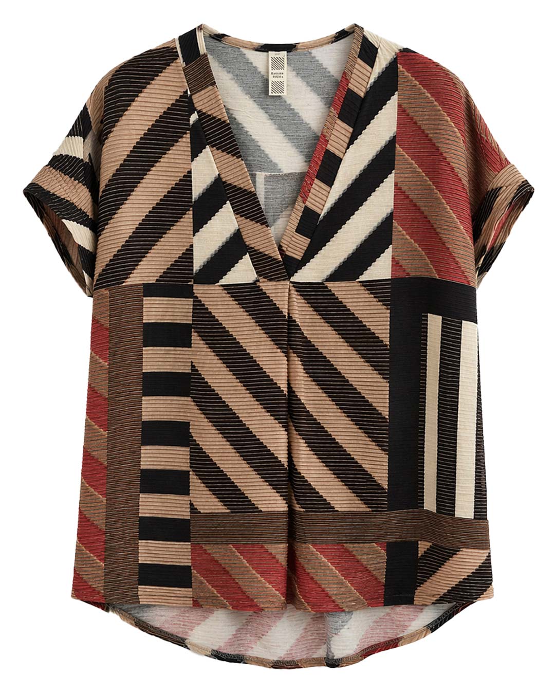 Blusa Mosaico ▷ ¡Marca la diferencia con el estampado más original de la temporada! Confeccionada en un tejido fluido de viscosa, esta blusa ofrece una caída ligera y fresca para mujeres reales. Su favorecedor escote en pico y bajo asimétrico redondeado aportan un aire juvenil y moderno. ¡Ideal para brillar en cualquier ocasión con Quile_Shop!