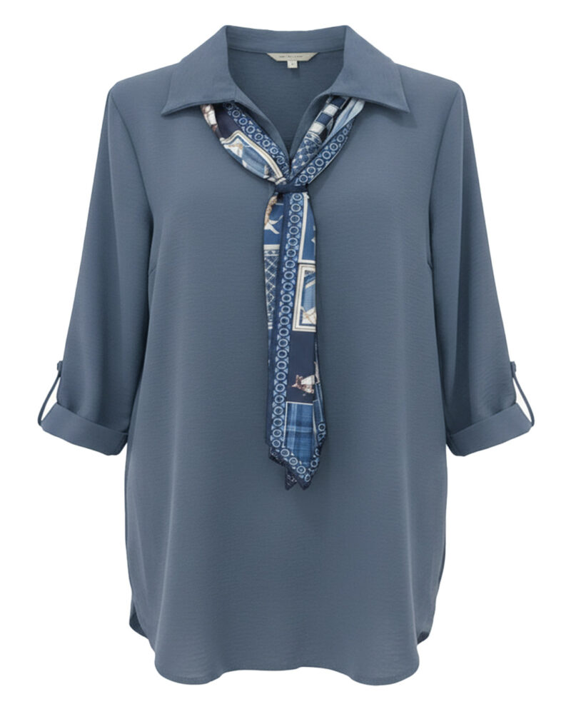 Blusa Pañuelo ▷ Esta sofisticada prenda destaca por su tejido fluido y su original detalle de pañuelo estampado en el cuello. Con manga larga ajustable y un corte holgado, es la opción ideal para mujeres reales de tallas curvy que buscan distinción y comodidad. Encuentra tu estilo único hoy en Quiles_Shop.