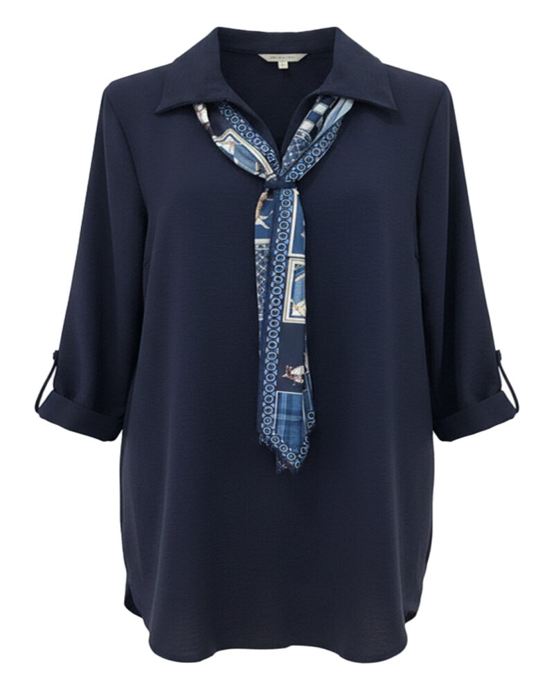 Blusa Pañuelo ▷ Esta sofisticada prenda destaca por su tejido fluido y su original detalle de pañuelo estampado en el cuello. Con manga larga ajustable y un corte holgado, es la opción ideal para mujeres reales de tallas curvy que buscan distinción y comodidad. Encuentra tu estilo único hoy en Quiles_Shop.