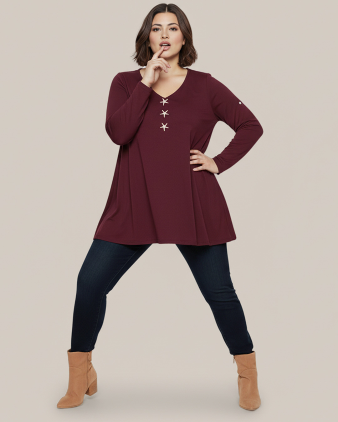 Blusa Santorini ▷ ¡Atrévete con un estilo de ensueño! Esta blusa con un toque de elegancia y un aire fresco te hará sentir especial. Su diseño de cuello en V y sus detalles dorados en la parte delantera la hacen única. Perfecta para un look con estilo. ¡Atrévete a brillar con nuestra moda low cost!
