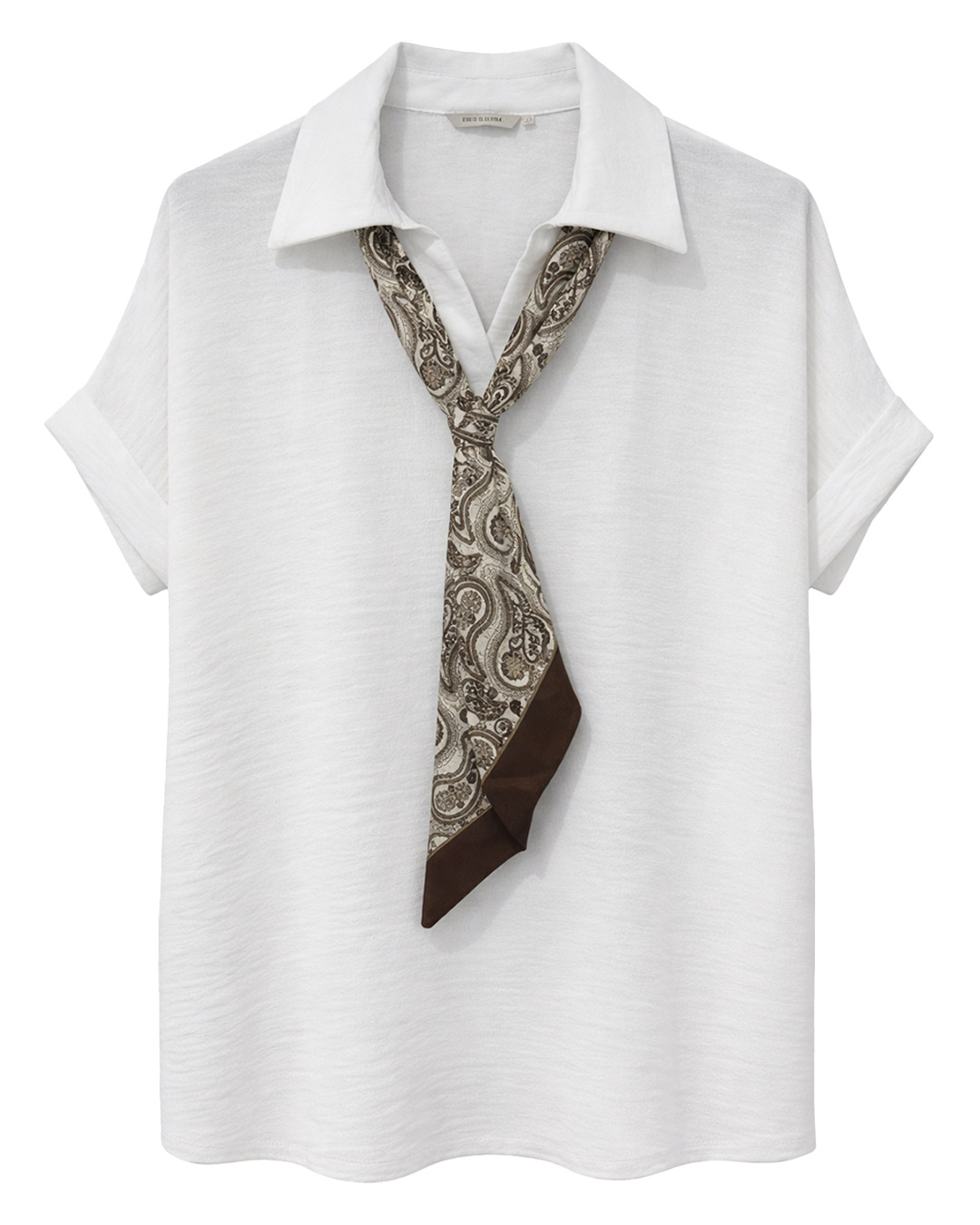 Camisa Pañuelo ▷ Esta prenda es pura sofisticación y versatilidad. Confeccionada en un tejido fluido con una caída impecable, destaca por su original detalle de pañuelo suelto en el cuello que aporta un aire chic. Con su diseño de manga corta y corte holgado, es la opción ideal para mujeres reales que buscan ir cómodas, frescas y con un estilo joven y pulido en cualquier ocasión.