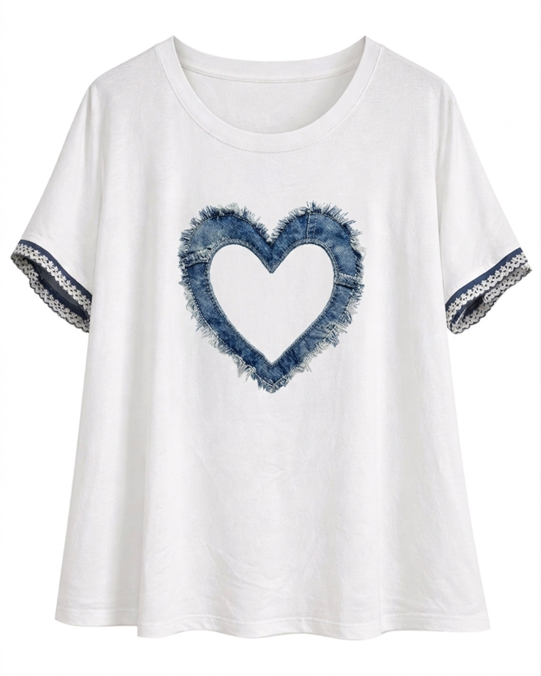Camiseta Chic Corazón ▷ Esta camiseta es la definición de estilo relajado con un toque especial. Confeccionada en un tejido de algodón de tacto súper suave, destaca por su parche central de denim deshilachado en forma de corazón y sus preciosos remates de encaje en las mangas. Diseñada para que las mujeres reales luzcan un aire joven y ultra cómodo todo el día.