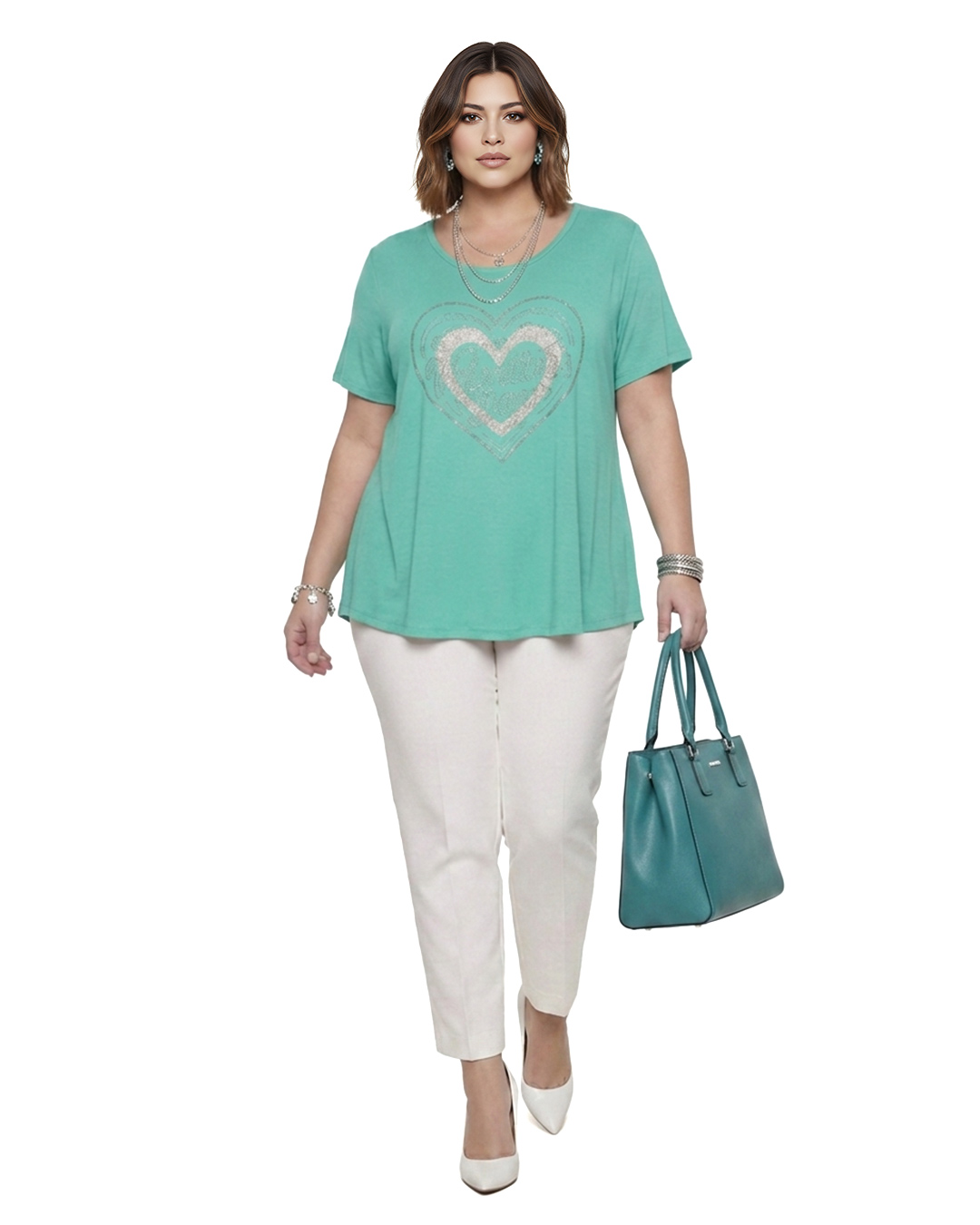 Camiseta Corazón ▷ Dale luz a tu armario con esta camiseta de punto suave y caída ligera que sienta de maravilla. Destaca por su precioso diseño central de corazón con detalles en strass, ideal para mujeres reales que buscan un estilo alegre y muy versátil. Con su cuello redondo y manga corta, es la aliada perfecta para disfrutar de un confort absoluto sin renunciar a la tendencia.