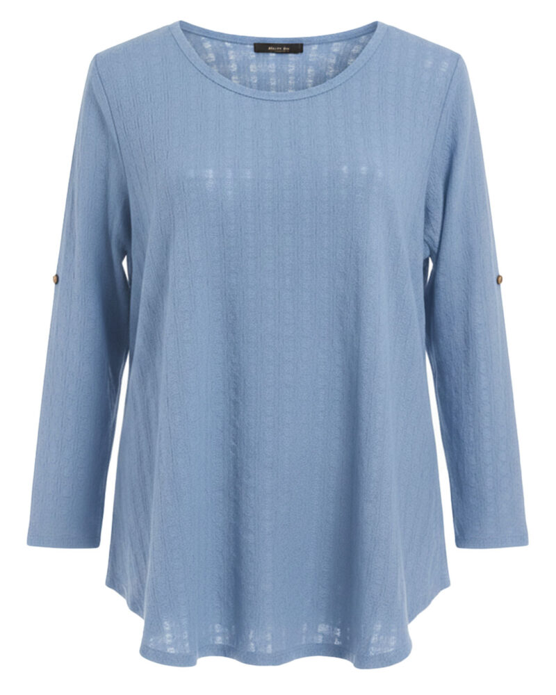 Camiseta Duna ▷ Este diseño destaca por su suave tejido de punto de viscosa que ofrece una caída fluida y ligera. Presenta cuello redondo, manga larga regulable con trabilla y botón, y un bajo ligeramente redondeado, siendo la prenda esencial para mujeres reales que buscan comodidad en Quiles_Shop.
