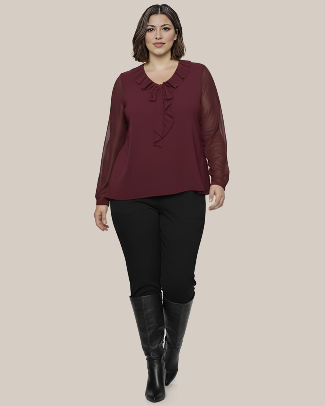 Camiseta Romantica ▷ ¡Añade un toque de feminidad y glamour a tu look de forma low cost! Esta camiseta en ideal para mujer curvy, tiene un escote en pico con volantes que le da un aire romántico. Sus mangas de tul sedoso son semitransparentes y le dan un toque juvenil y sofisticado. Es perfecta para looks arreglados o de noche. ¡Pídela ahora!