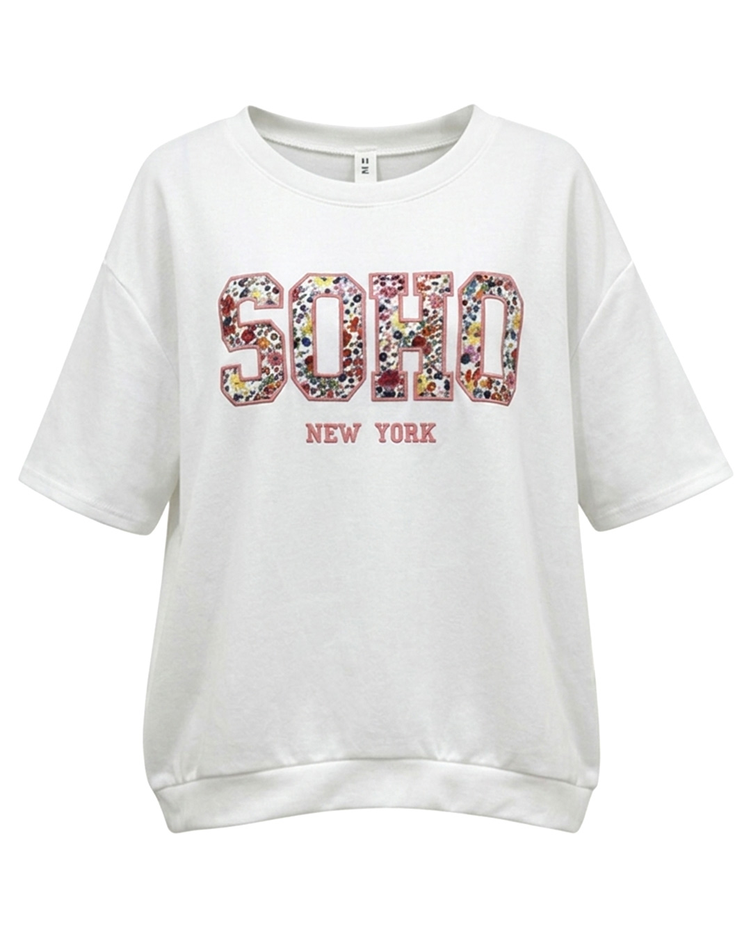 Camiseta Soho ▷ Descubre la calidad de su tejido con mezcla de algodón y gramaje premium, diseñada para ofrecer durabilidad y un ajuste impecable. Destaca por su vibrante estampado frontal con letras florales y relieve, ideal para mujeres reales que buscan un estilo joven y auténtico en Quiles_Shop.