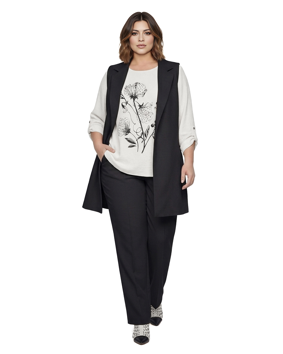 Chaleco Crepé ▷ Esta prenda de corte impecable destaca por su tejido fluido sin forro, lo que garantiza una ligereza y caída espectacular. Presenta solapas clásicas renovadas y un diseño abierto que estiliza la figura al instante, siendo el aliado perfecto para mujeres reales de tallas curvy. Combínalo con nuestro Pantalón Crepé Pinzas para un Lookazo.
