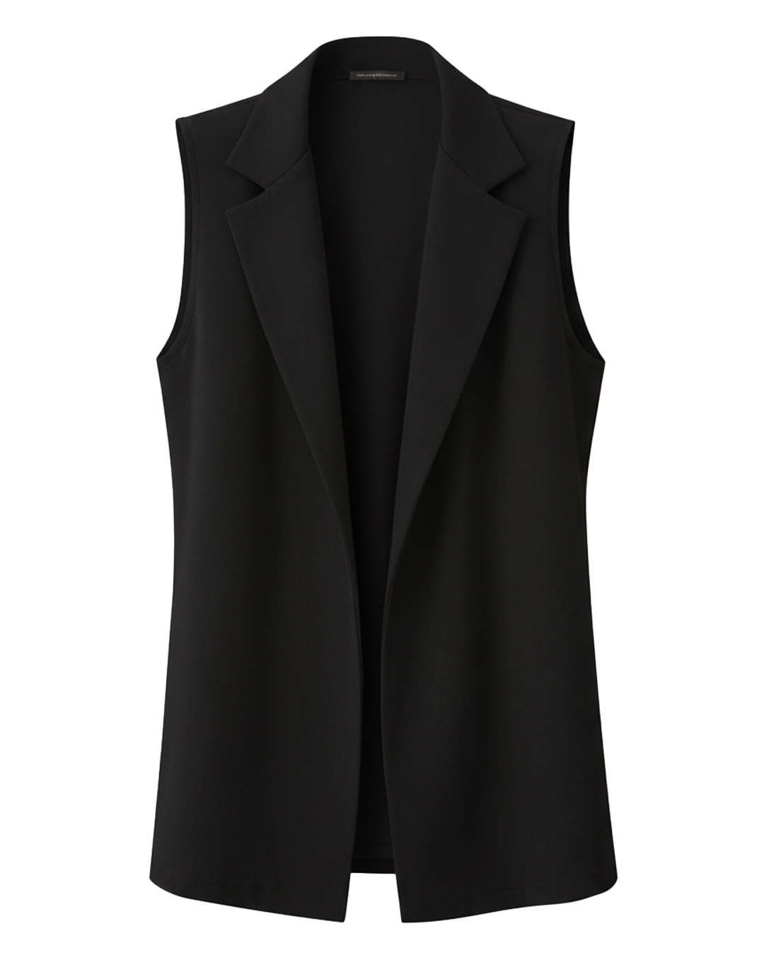 Chaleco Crepé ▷ Esta prenda de corte impecable destaca por su tejido fluido sin forro, lo que garantiza una ligereza y caída espectacular. Presenta solapas clásicas renovadas y un diseño abierto que estiliza la figura al instante, siendo el aliado perfecto para mujeres reales de tallas curvy. Consigue hoy mismo tu básico más sofisticado en Quiles_Shop.