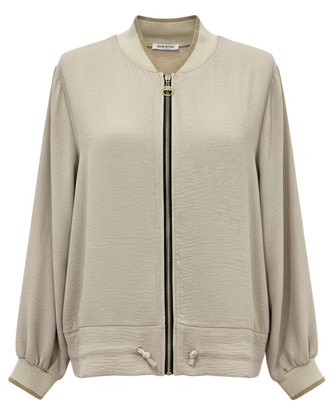 Chaqueta Bomber ▷ Esta prenda destaca por su tejido fluido de caída espectacular y su elegante tono arena. Presenta cierre frontal de cremallera, cuello y puños elásticos con sutiles detalles brillantes. Un diseño ligero y versátil pensado para favorecer a mujeres reales de tallas curvy con el estilo inconfundible de Quiles_Shop.
