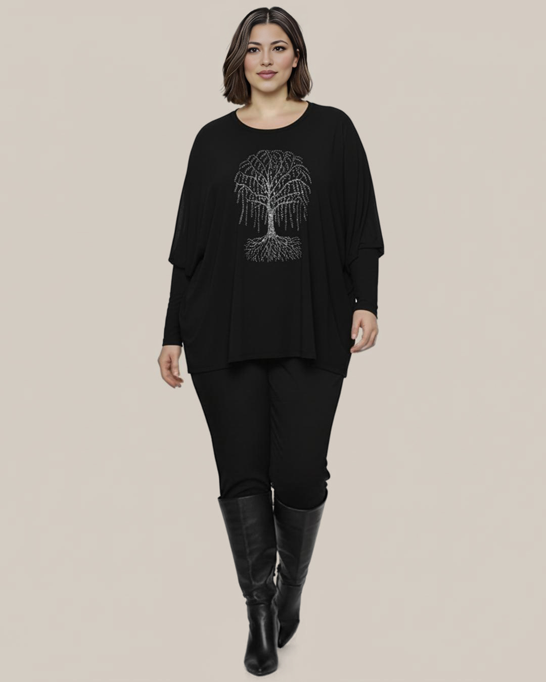 Jersey Árbol Vida ▷ ¡Un jersey lleno de significado con un glamour inigualable! Este modelo oversize es ideal para tallas grandes, ofreciendo un fit juvenil y cómodo. El espectacular Árbol de la Vida está hecho con pequeños brillantes que le dan un toque chic. Es de manga larga y tejido en tacto lana. ¡Vístete a la moda curvy y con personalidad! ¡Fíchalo en Quiles_Shop!