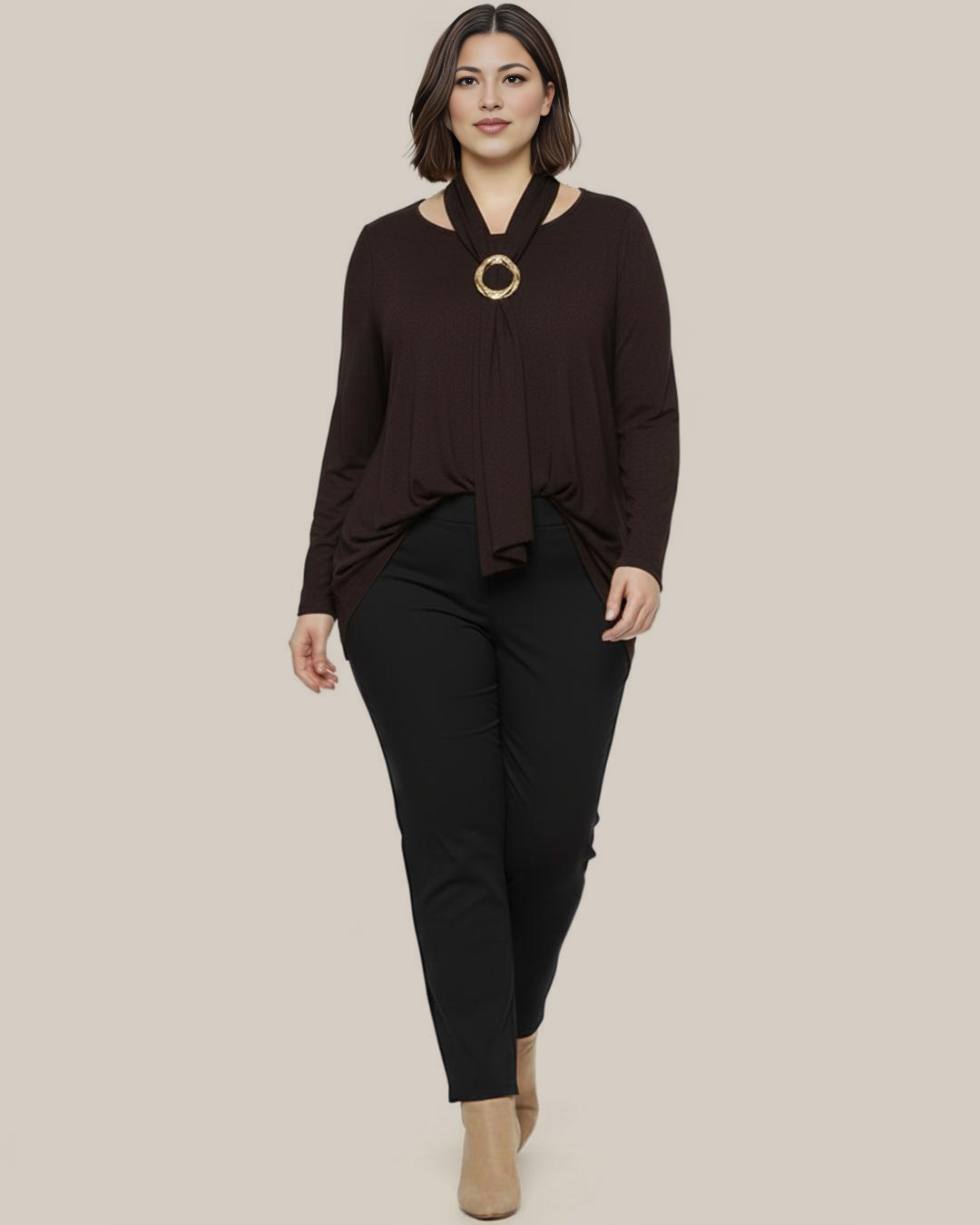 Jersey Cóctel ▷ ¡Una pieza imprescindible para elevar tu armario esta temporada! Este jersey es ideal para tallas grandes, confeccionado en un tejido sutilmente texturizado con un toque de brillo. Destaca su pañuelo con un elegante broche joya. El cuello redondo y el bajo curvo le dan un fit sofisticado y fluido. ¡Es perfecto para cualquier evento! ¡Encuentra el glamour en Quiles_Shop!