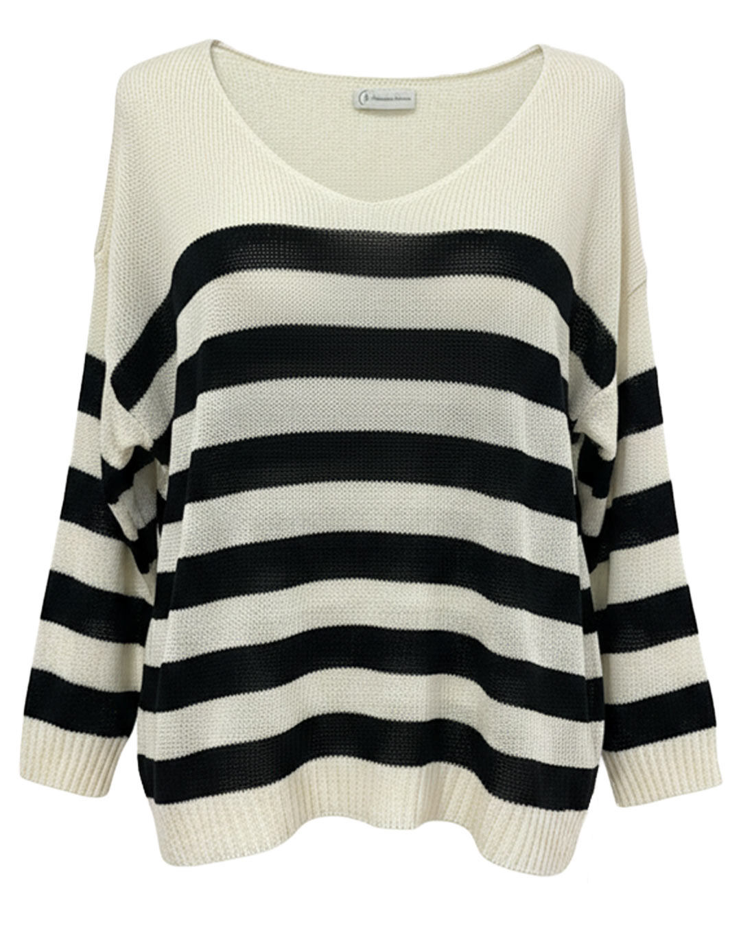 Jersey Marinero Chic ▷ Disfruta de la frescura y suavidad de este tejido de hilo, ideal para los días de entretiempo. Su diseño atemporal de rayas y corte relajado favorece a todas las siluetas, aportando un aire sofisticado y cómodo. Una prenda esencial de tendencia low cost en Quiles_Shop.