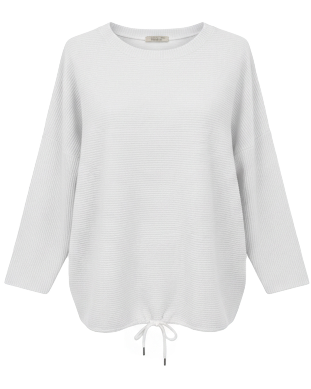 Jersey Textura ▷ Esta prenda esencial destaca por su tejido acanalado de primavera, diseñado para ofrecer un tacto ultra suave y una caída ligera. Su corte holgado con manga francesa y detalle de cordón ajustable en el bajo garantiza comodidad absoluta para mujeres reales. Encuentra tu estilo más tierno en Quiles_Shop.