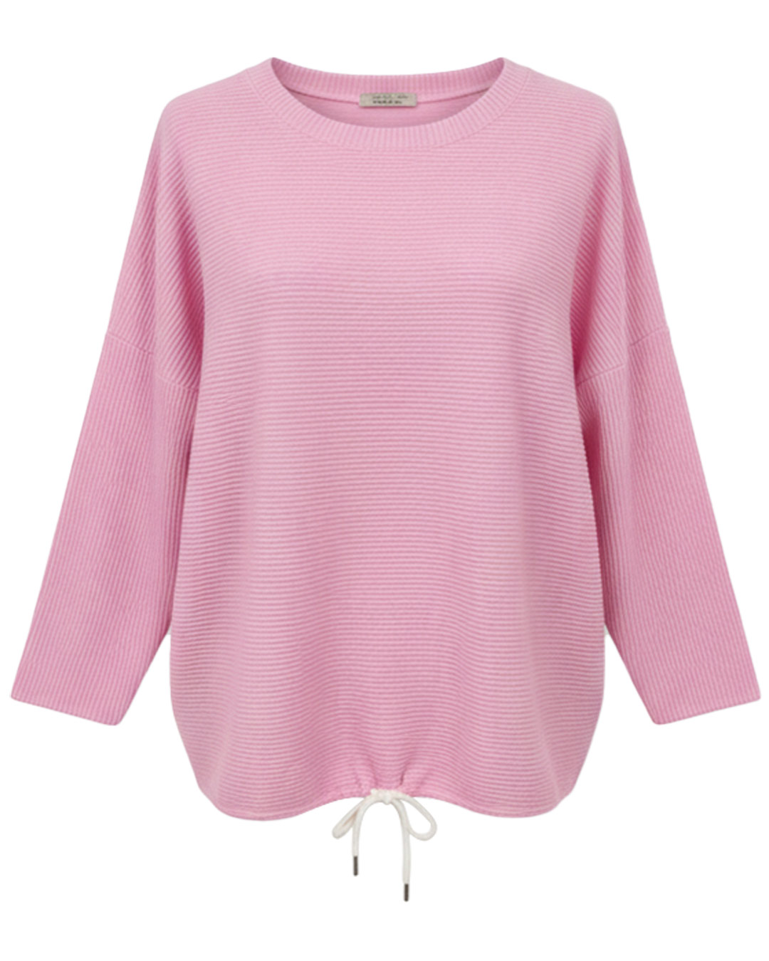 Jersey Textura ▷ Esta prenda esencial destaca por su tejido acanalado de primavera, diseñado para ofrecer un tacto ultra suave y una caída ligera. Su corte holgado con manga francesa y detalle de cordón ajustable en el bajo garantiza comodidad absoluta para mujeres reales. Encuentra tu estilo más tierno en Quiles_Shop.