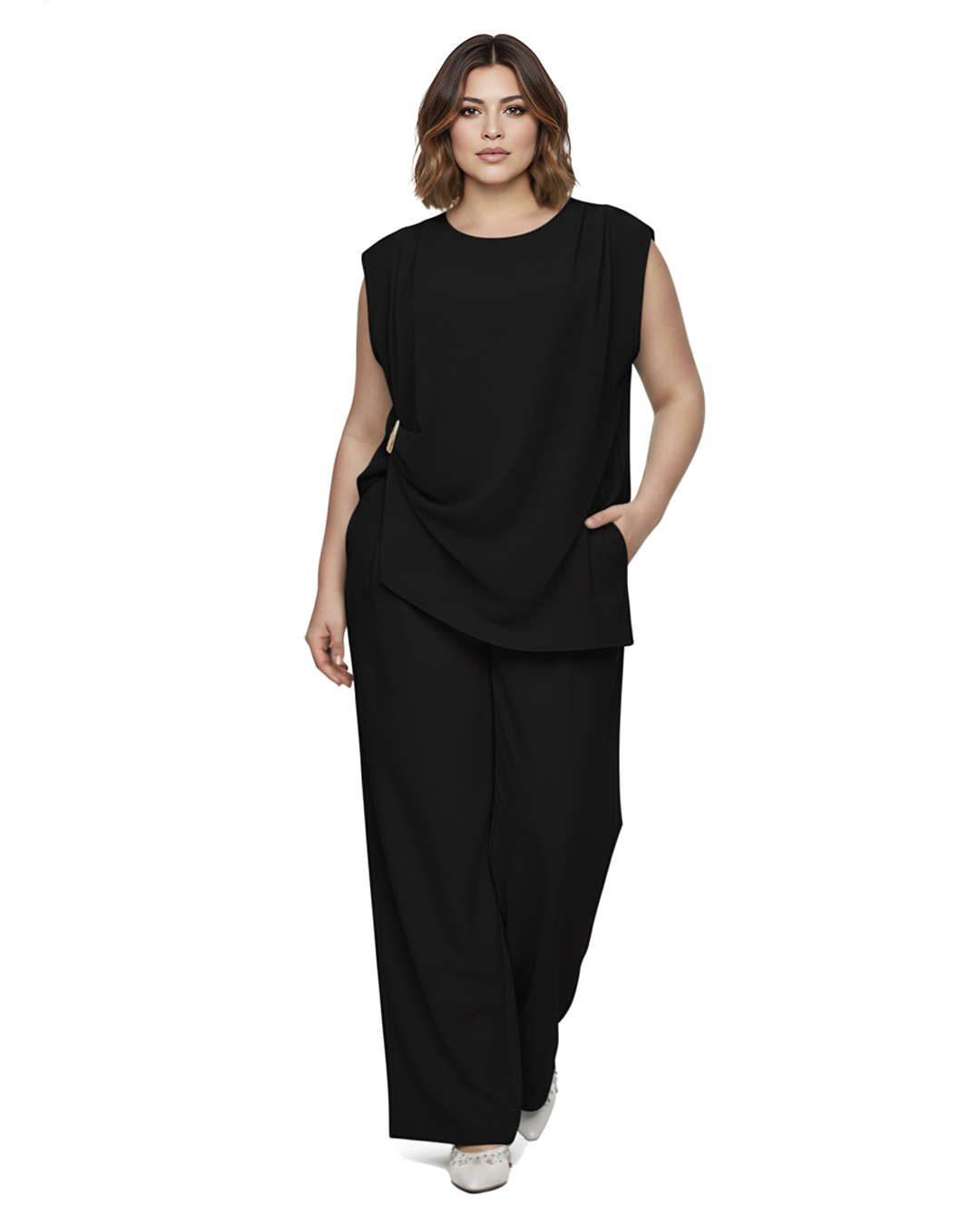 Outfit Drap ▷ Deslumbra con un diseño que fusiona la sofisticación del crepé y la libertad del elastán en un conjunto que fluye con cada uno de tus pasos. Su blusa con drapeado lateral artístico y pantalón de pierna ancha crean una armonía visual perfecta, diseñada para que las mujeres reales se sientan seguras, cómodas y absolutamente radiantes en sus eventos más especiales.