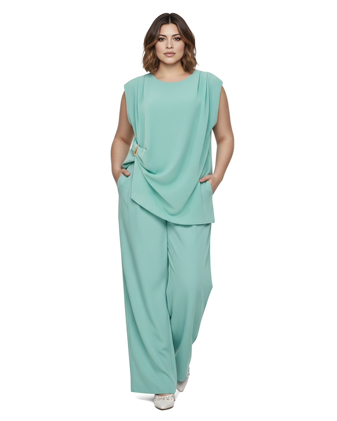 Outfit Drap ▷ Deslumbra con un diseño que fusiona la sofisticación del crepé y la libertad del elastán en un conjunto que fluye con cada uno de tus pasos. Su blusa con drapeado lateral artístico y pantalón de pierna ancha crean una armonía visual perfecta, diseñada para que las mujeres reales se sientan seguras, cómodas y absolutamente radiantes en sus eventos más especiales.