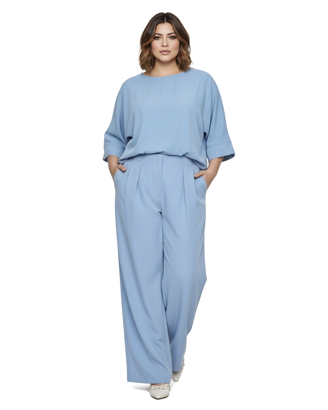Outfit Minimal ▷ Este conjunto de dos piezas está confeccionado en un tejido de viscosa con un toque de elastán para ofrecer una caída impecable. Su diseño de líneas puras con blusa de manga japonesa y pantalón de pinzas garantiza libertad de movimiento a las mujeres reales que eligen la sofisticación para su próximo evento en Quiles_Shop.