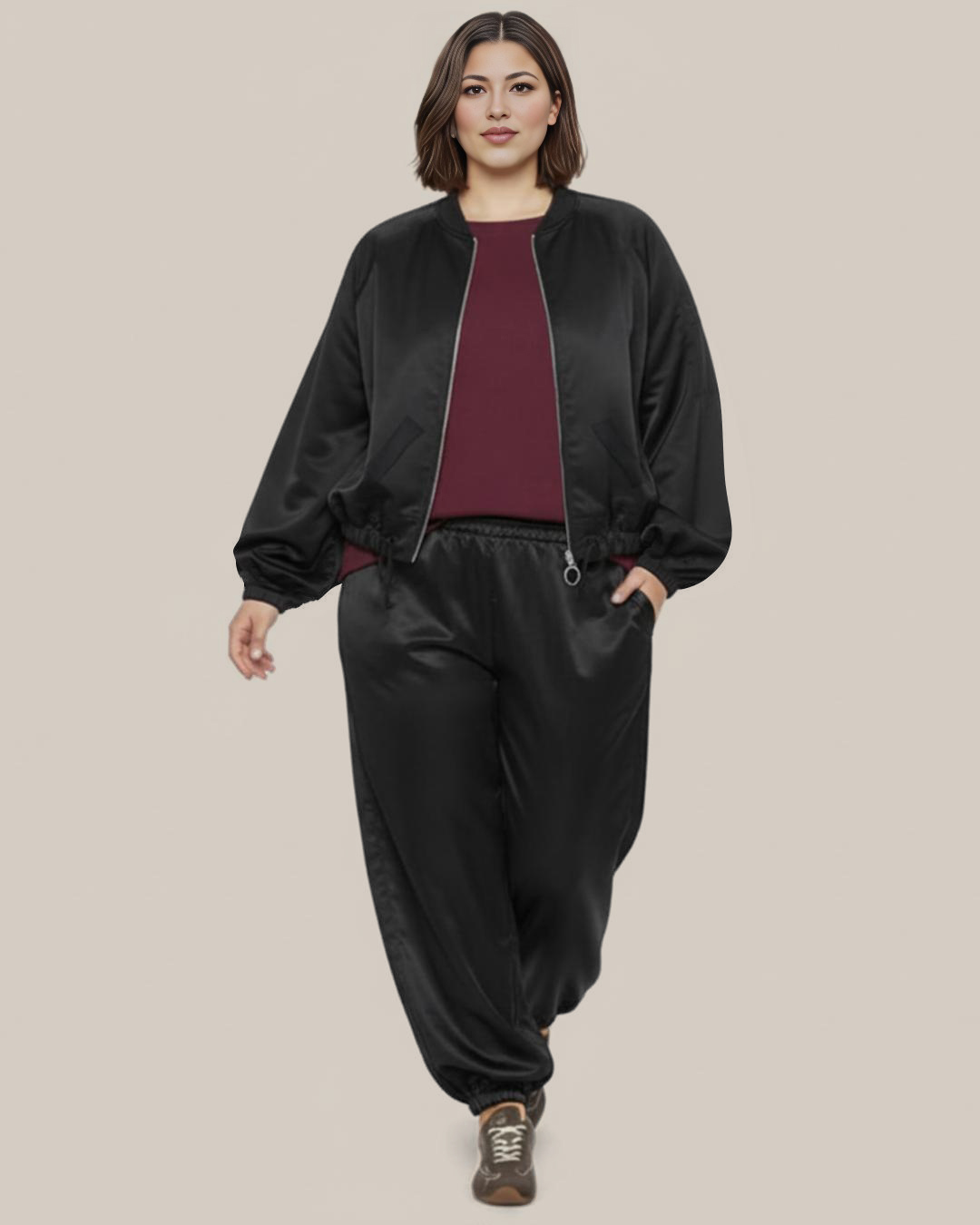 Outfit Satén ▷ ¡El conjunto sporty-chic más elegante y cómodo de la temporada! Este dos piezas combina la tendencia de la Chaqueta Bomber cropped con el Pantalón Bombacho de cintura elástica. El suave tejido de Satén le da un toque sofisticado, perfecto para ir cómoda pero sofisticada. ¡Consigue este outfit low cost y presume de estilazo!