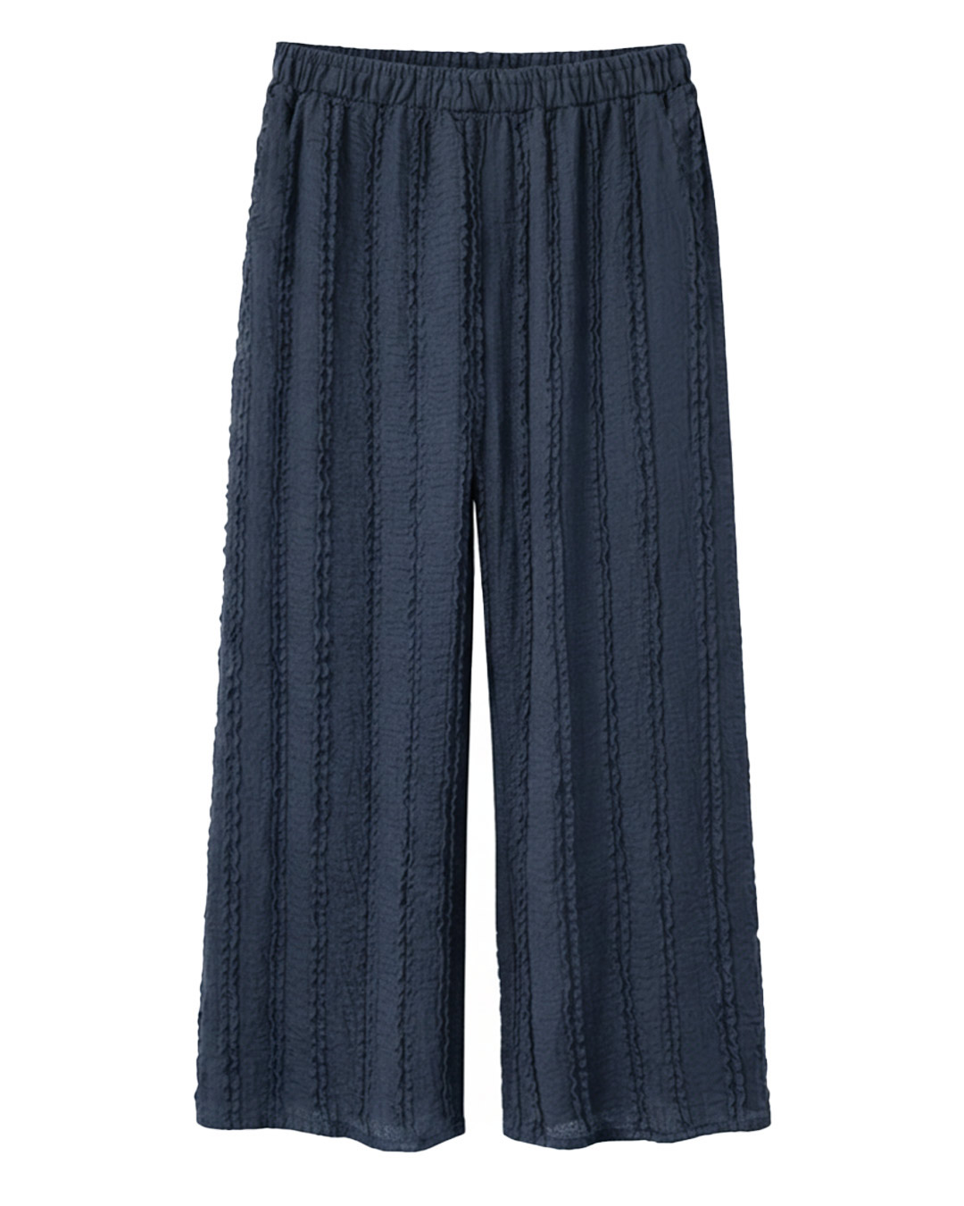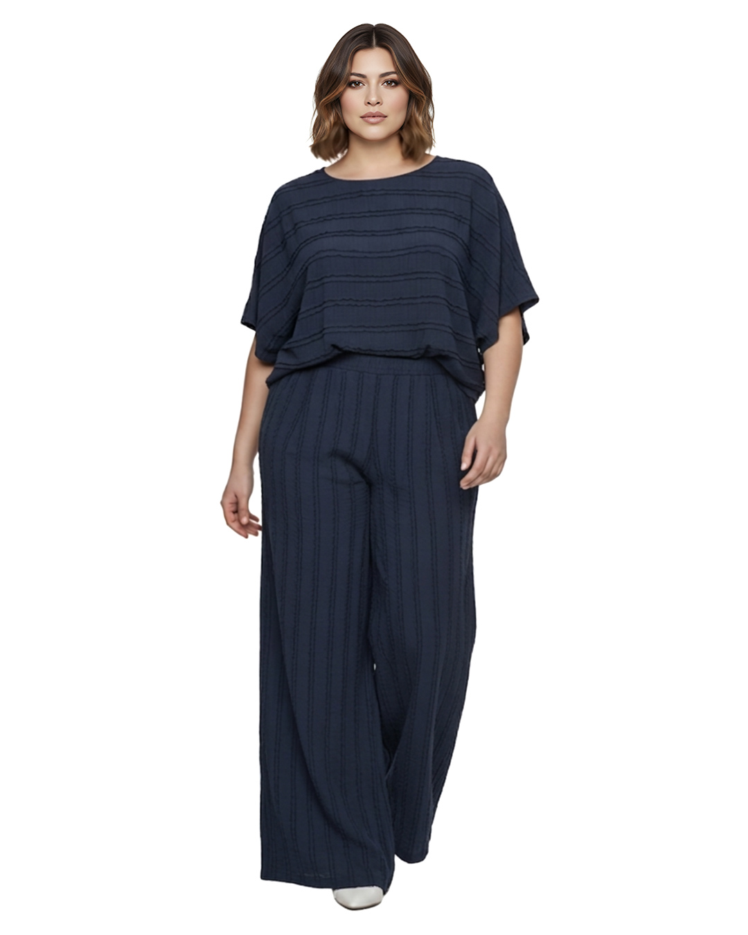 Outfit Textura ▷ Este exclusivo conjunto de dos piezas está confeccionado en un suave tejido de punto con una textura de líneas en relieve. Incluye una camiseta de corte holgado y pantalones de pierna ancha con cintura elástica, diseñado para ofrecer libertad de movimiento a mujeres reales en Quiles_Shop.