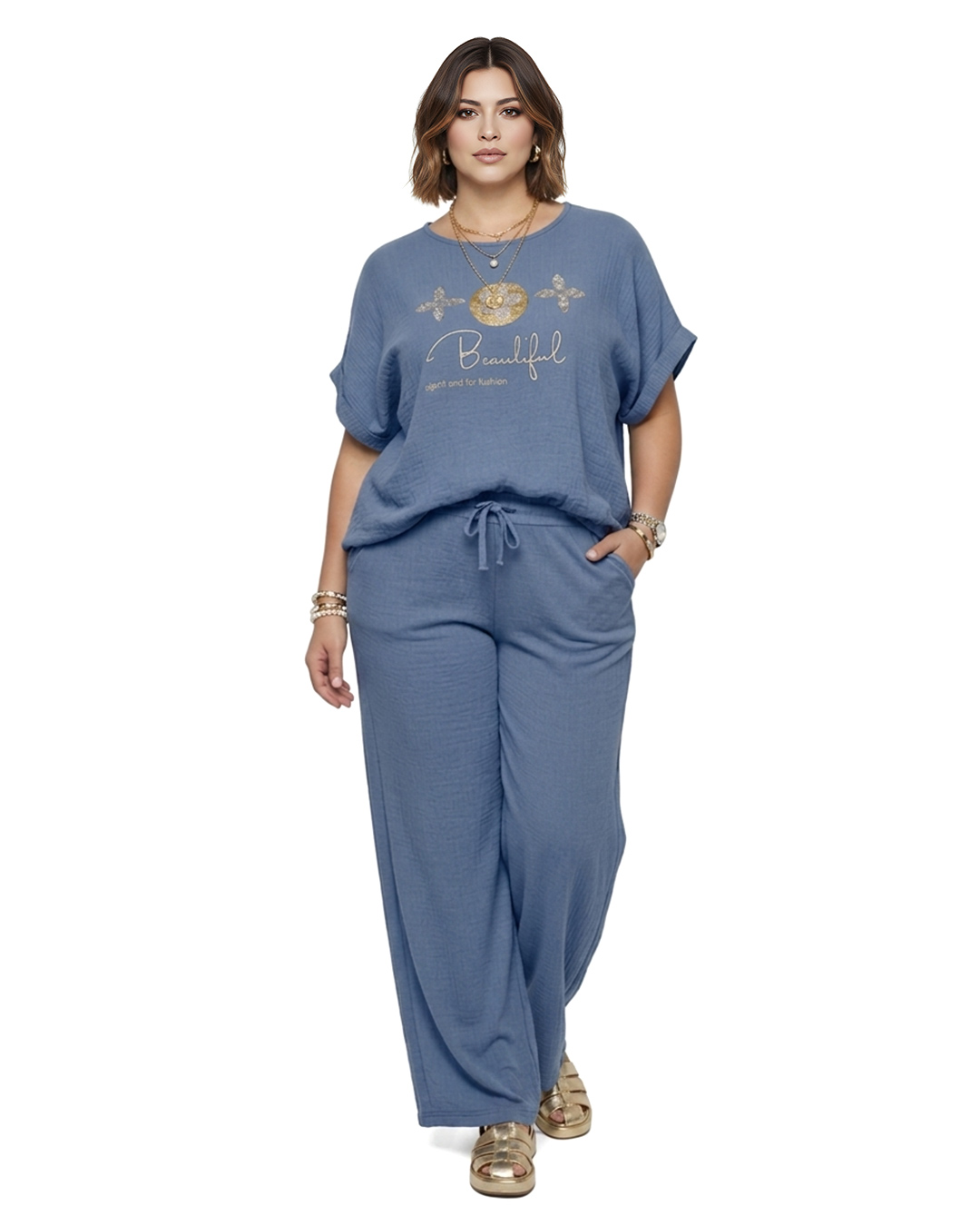 Pantalón Balear ▷ Destaca por su suave tejido con efecto arrugado que ofrece una caída ligera y mucho movimiento. Presenta cintura elástica completa con cordón ajustable y un corte de pierna ancha, siendo la opción perfecta para mujeres reales que buscan bienestar y estilo en Quiles_Shop. Total Look: combínala con nuestra Camiseta Balear.