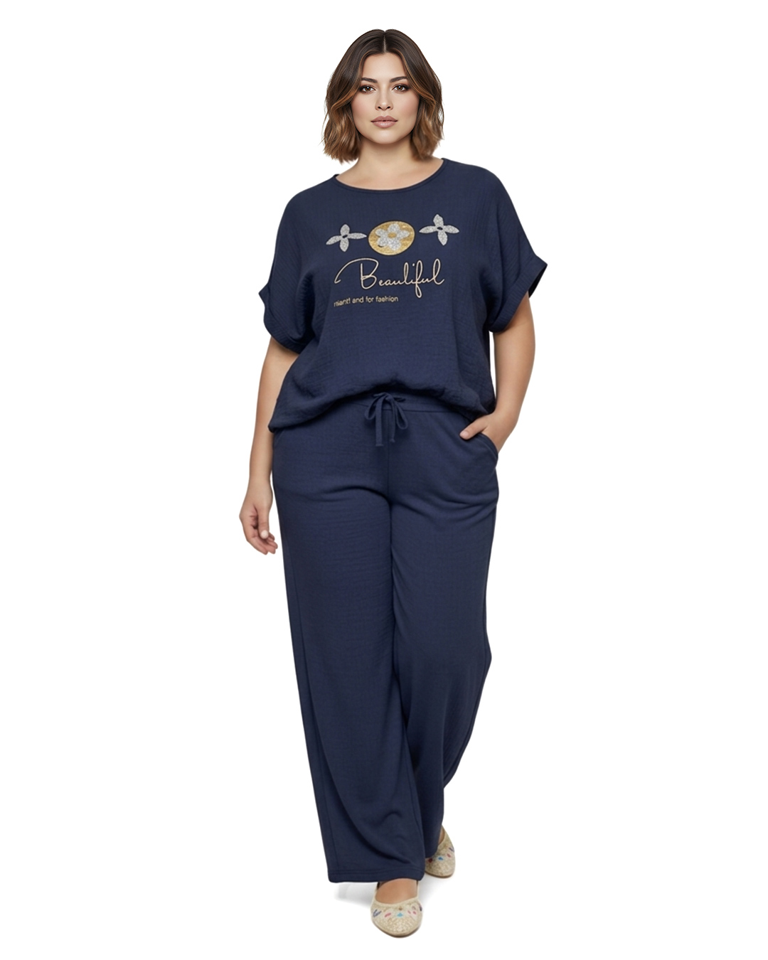 Pantalón Balear ▷ Destaca por su suave tejido con efecto arrugado que ofrece una caída ligera y mucho movimiento. Presenta cintura elástica completa con cordón ajustable y un corte de pierna ancha, siendo la opción perfecta para mujeres reales que buscan bienestar y estilo en Quiles_Shop. Total Look: combínala con nuestra Camiseta Balear.