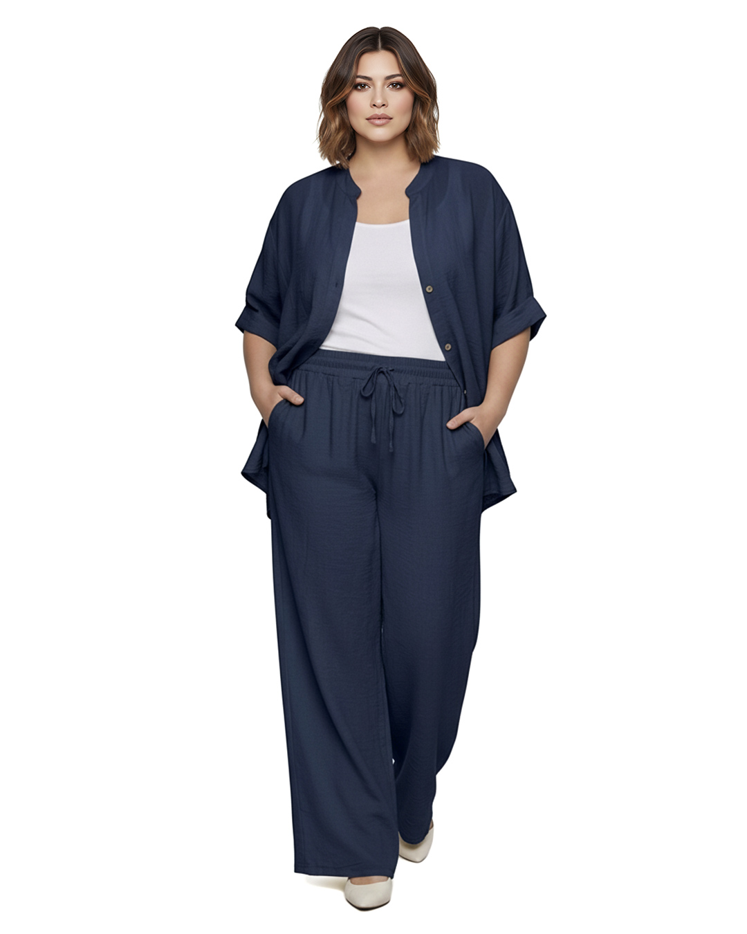 Pantalón Bambula ▷ Esta prenda está confeccionada en un tejido de viscosa con un característico efecto arrugado que aporta textura y ligereza. Su diseño de pierna ancha cuenta con cintura elástica ajustable mediante cordón y prácticos bolsillos, ideal para mujeres reales que buscan confort y estilo joven en su día a día. Completa el Look con su camisa a juego.