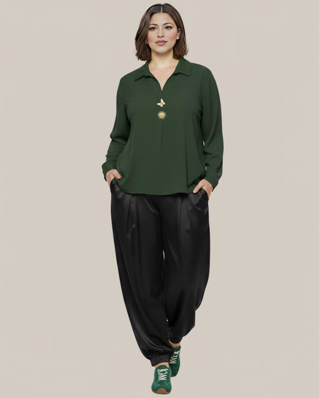 Pantalón Bombacho Satén ▷ ¡El pantalón más cómodo y sofisticado que vas a encontrar! Su tejido de satén le da una caída fluida y un brillo sutil, ideal para un look elevado. Presenta un moderno corte bombacho que favorece a tallas grandes, cintura elástica y prácticos bolsillos. ¡Luce esta tendencia por un precio low cost!