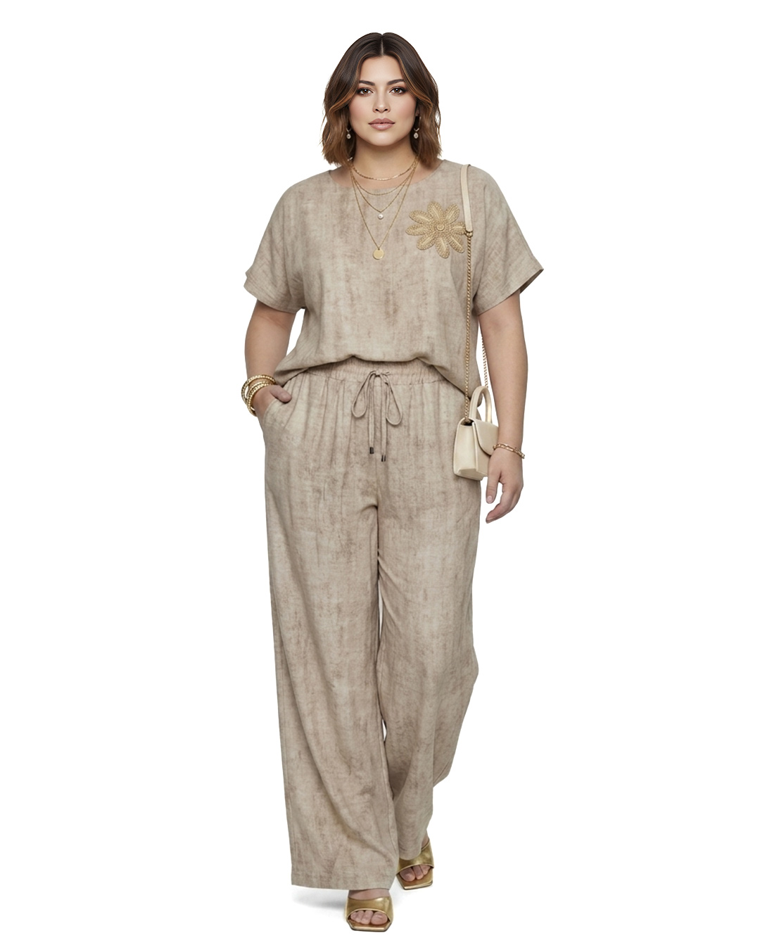 Pantalón Versalles ▷ ¡Redefine tu estilo con la máxima fluidez! Este pantalón destaca por su tejido ligero y un acabado sutilmente texturizado que aporta un aire de lujo relajado. Diseñado con cintura elástica ajustable y bolsillos para ofrecer un confort total a mujeres reales, su corte ancho garantiza elegancia en cada movimiento. ¡Consigue un lookazo, combinándolo con nuestra Blusa Versalles!