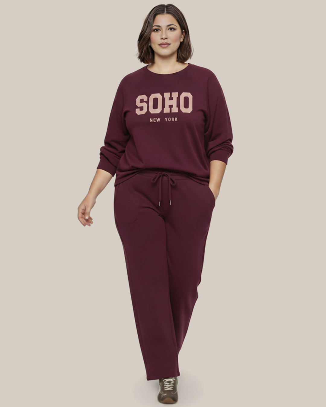 Sudadera Soho ▷ ¡Consigue el total look neoyorquino más cool con esta sudadera low cost! Su diseño oversize y manga murciélago es perfecto para un fit cómodo y juvenil en tallas grandes. El tejido en neopreno suave y con el print «SOHO NEW YORK» la hacen una prenda de tendencia. Combínala con nuestro Pantalón Jogger Palazzo (mismo color y tejido) para un total look ideal.