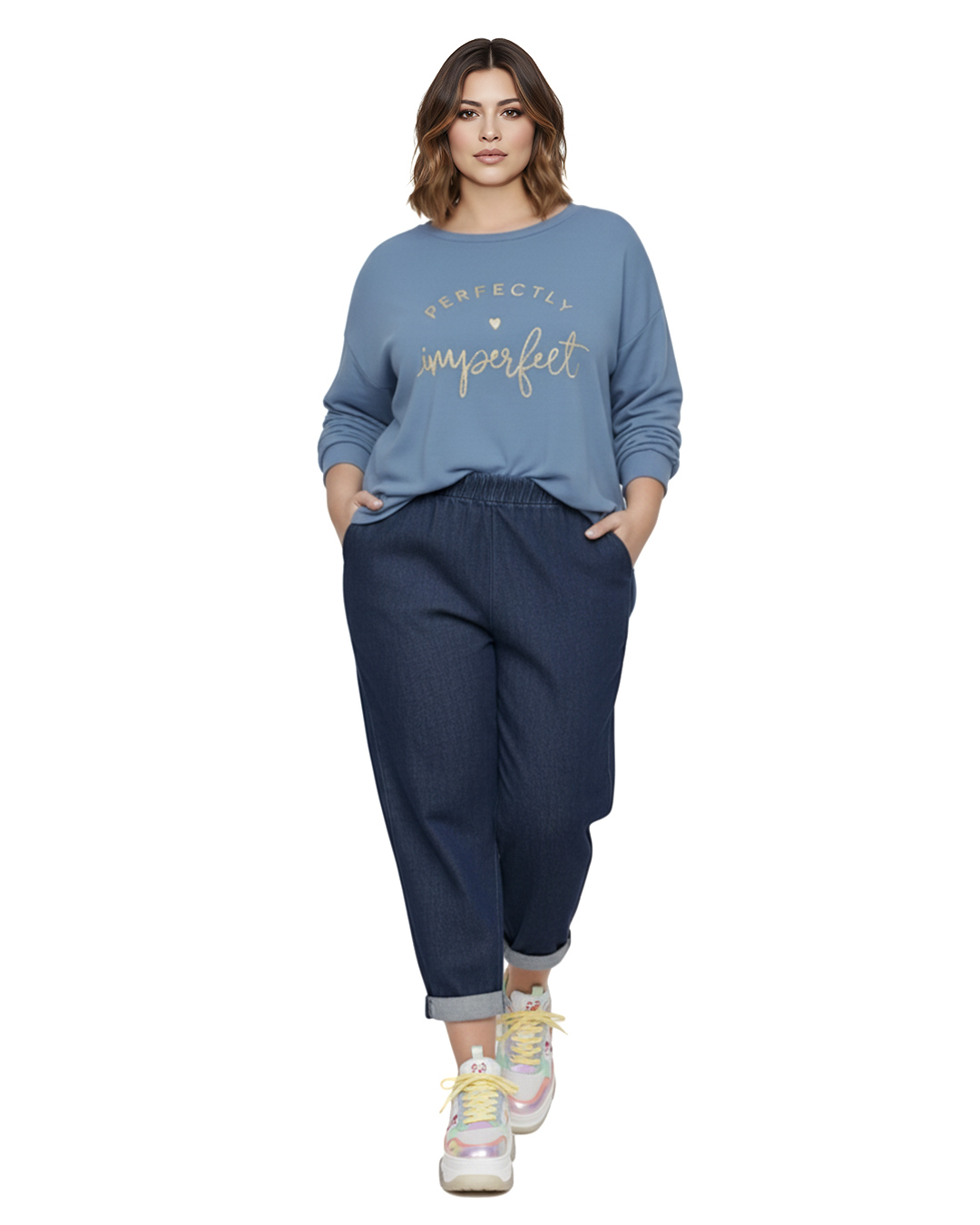Vaquero Confort ▷ Este pantalón destaca por su tejido efecto vaquero compuesto por algodón y un toque de elastán para una adaptabilidad superior. Presenta cintura elástica completa, bolsillos funcionales y bajo con vuelta, siendo la opción ideal para mujeres reales que buscan comodidad absoluta y estilo en Quiles_Shop.