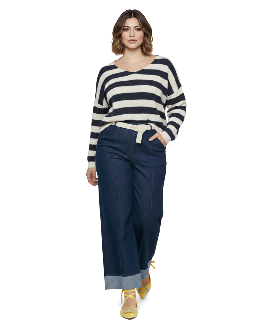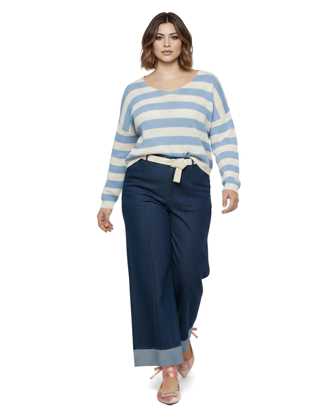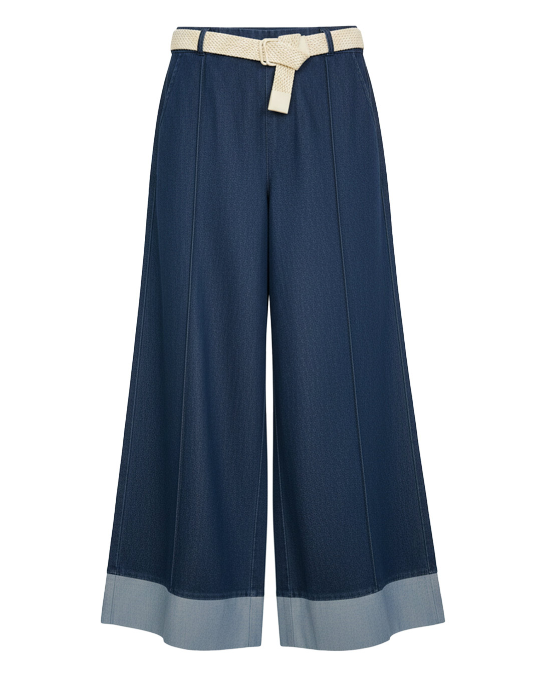 Vaquero Náutico ▷ Déjate seducir por la suavidad extrema de este tejido denim con elastano que se adapta a tu silueta con total libertad. Su diseño de pierna ancha con detalle de vuelta en el bajo y cinturón trenzado incluido define un estilo sofisticado y en tendencia para mujeres reales en Quiles_Shop.