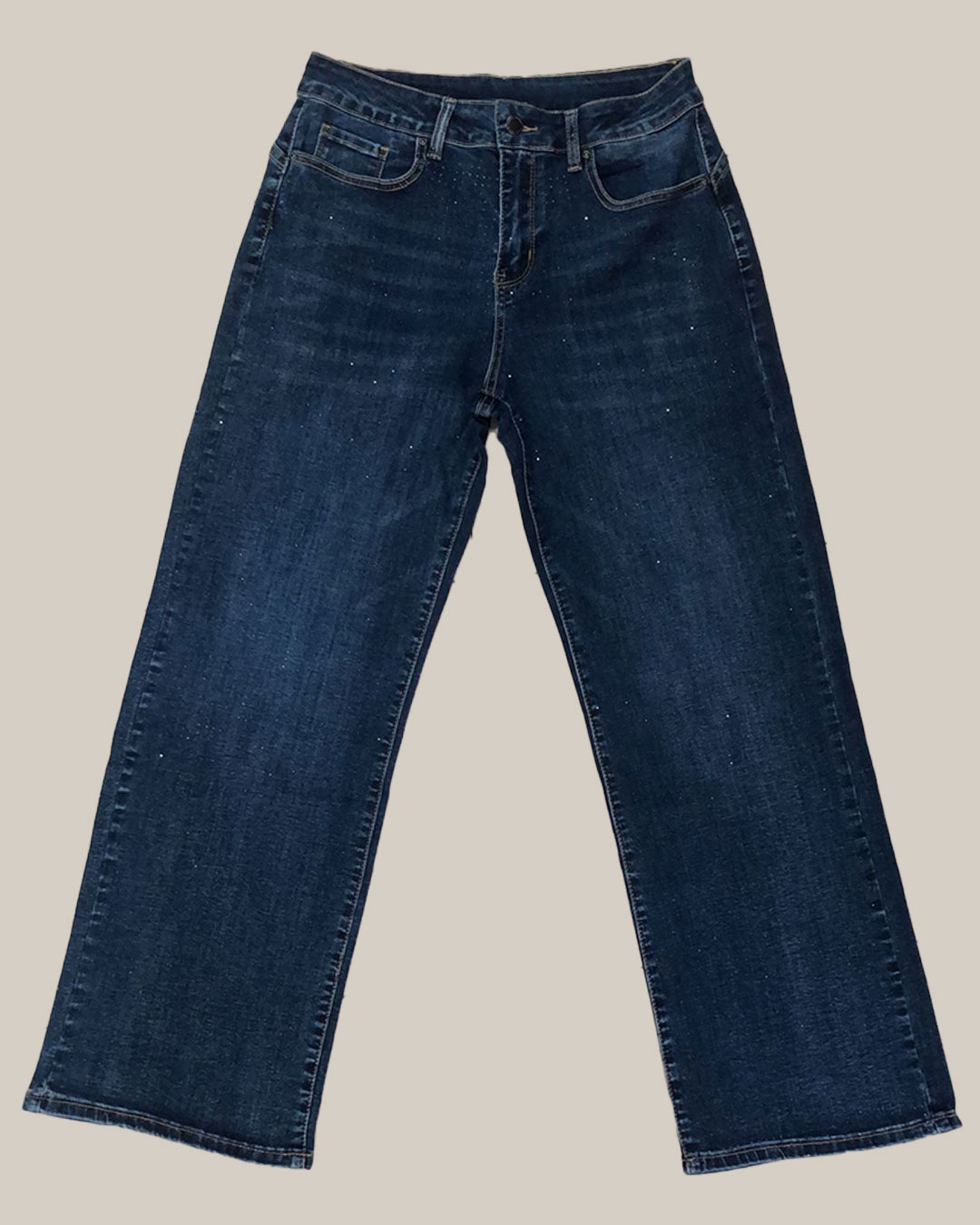Vaqueros Strass ▷ ¡Pantalón efecto tipazo que no querrás quitarte! Estos jeans son comodísimos y tienen un corte wide leg que está súper de moda. El detalle de micro-strass les da un rollo muy en tendencia, juvenil y muy cool. Son de tiro alto, llevan un toque de elastán y sientan genial. ¡No te quedes sin tus vaqueros estrella, cómpralos ya!