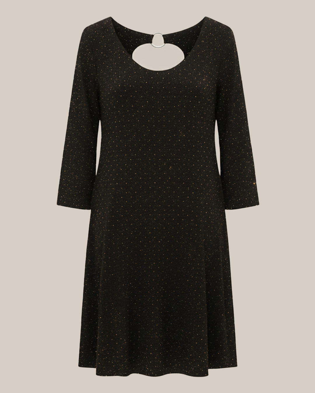 Vestido Dior ▷ ¡El detalle que marca la diferencia en tu outfit de fiesta! Está confeccionado en punto fluido, lo que asegura comodidad y una caída elegante. Presenta pequeños detalles de strass por toda la prenda para un brillo sutil. El corte es recto y juvenil, con manga francesa y un original escote redondo con cut-out en la espalda. ¡Brilla con glamour!