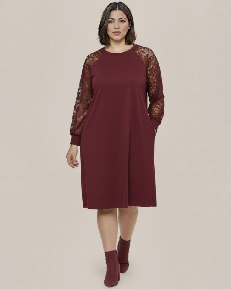 Vestido Encaje ▷ ¿Quieres unir estilo chic y confort total? Este vestido es ideal para tallas grandes y está confeccionado en neopreno fluido con buen gramaje para una caída perfecta. Destacan sus mangas de blonda de encaje suave con volumen y sus bolsillos funcionales. Su corte recto estiliza sin apretar. ¡El look que necesitas para tu próximo evento!
