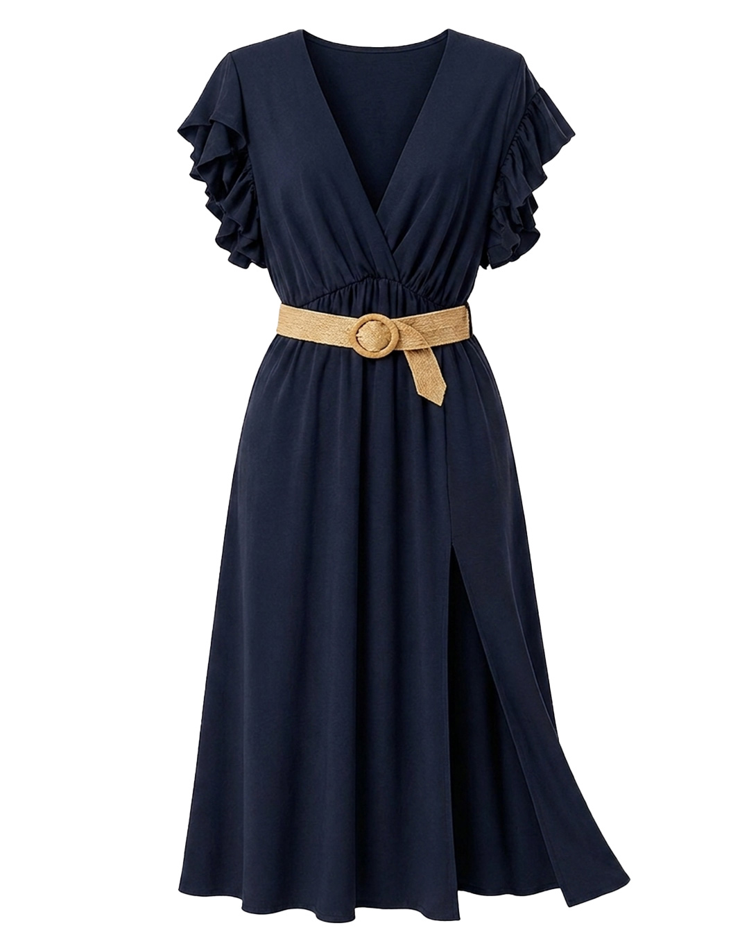 Vestido Romántico ▷ ¡Enamórate del diseño más dulce y favorecedor! Este vestido destaca por su caída fluida y sus preciosas mangas con volantes que aportan un aire etéreo y chic. Diseñado para realzar la figura de mujeres reales, incluye un cinturón efecto rafia que marca la cintura con elegancia y una apertura lateral en la falda para mayor movimiento. ¡Siéntete radiante en cada paso!