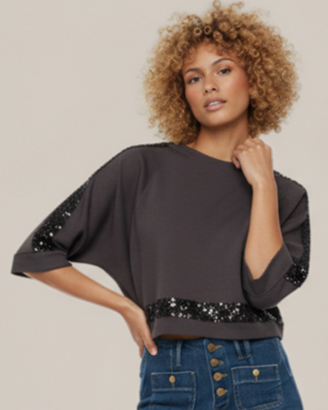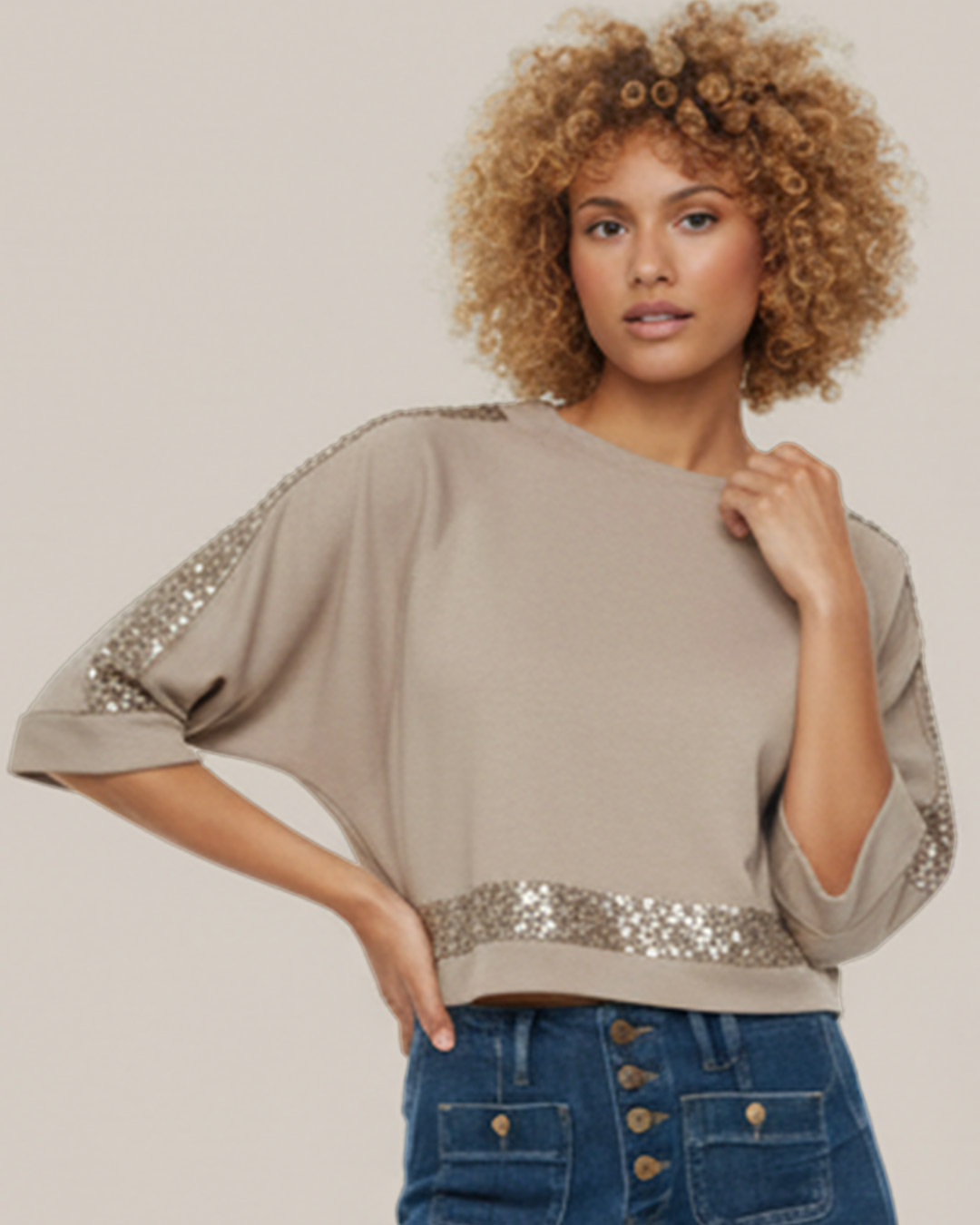 Sudadera Glam Beige ▷ ¡Brilla con un toque de glamour sin esfuerzo! Esta sudadera oversize es la mezcla perfecta de comodidad y estilo. Confeccionada con un suave tejido en neopreno y un corte moderno, destaca por sus bandas de lentejuelas en hombros y bajo, que le dan un aire festivo y chic. ¡Ideal para elevar cualquier look y ser la más cool! ¡Hazte con la tuya y a brillar!